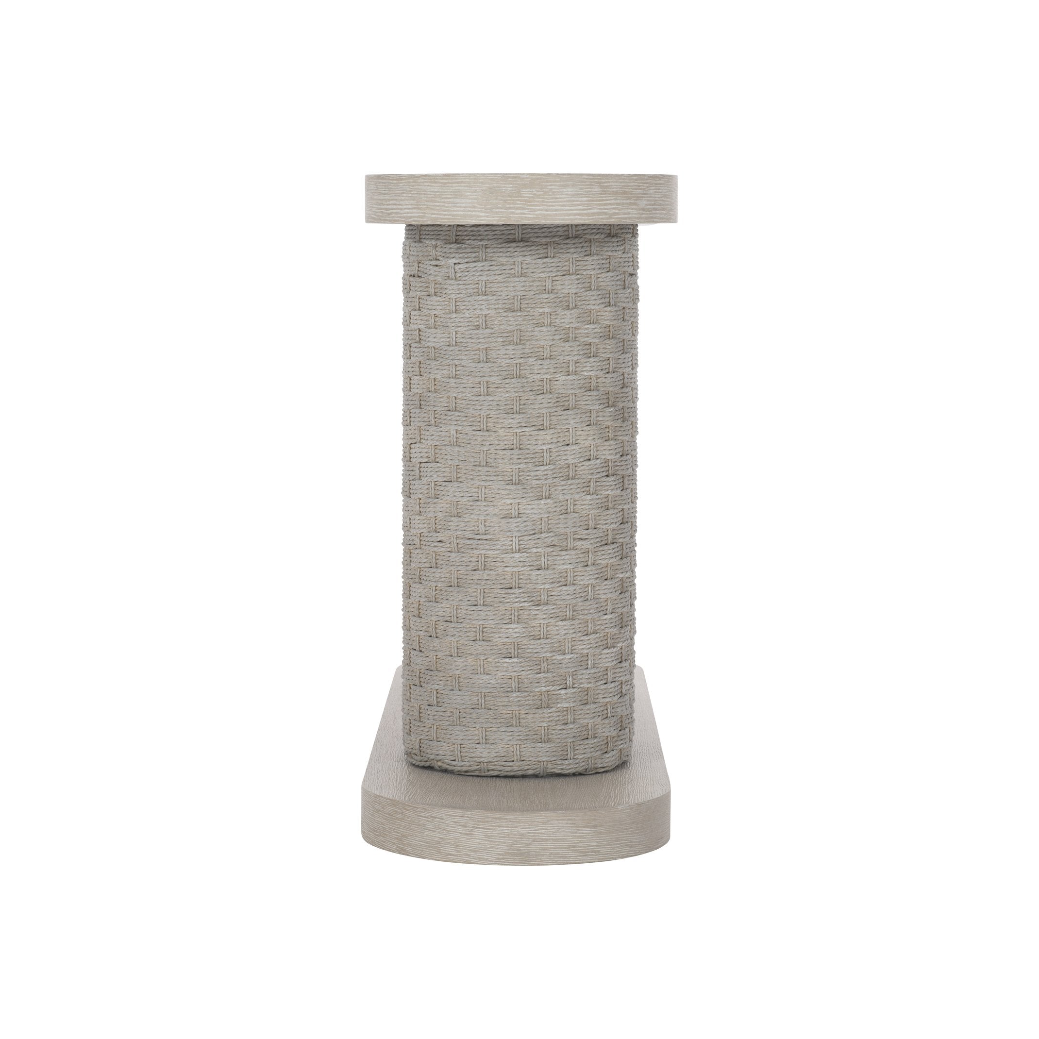 - Off-center pedestal wrapped in woven twisted paper rope.