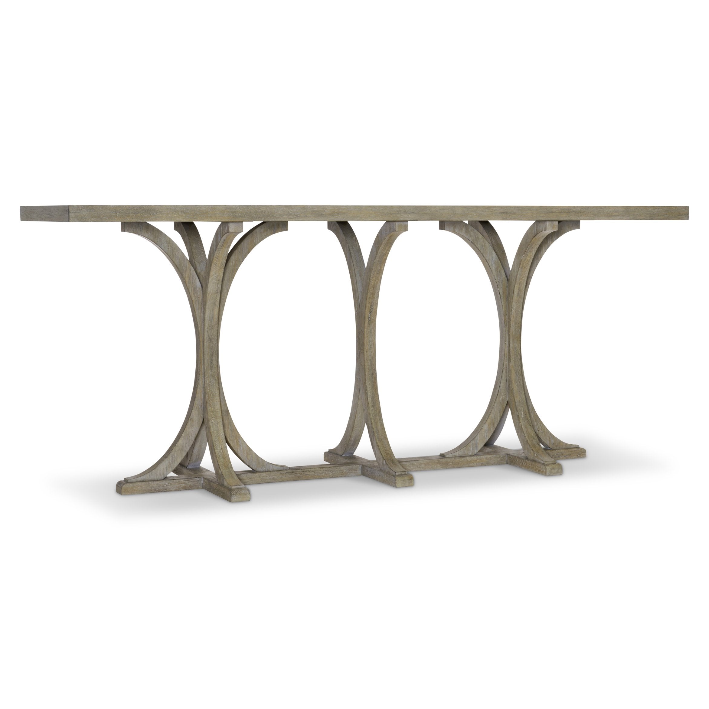 Experience timeless American style with the Bernhardt Albion console table — where refined arcs meet clean lines to create a balanced, sculptural centerpiece. Its combination of solid and veneered white oak, soft pewter finish, and subtle woodgrain texture lends a vintage-inspired yet modern presence that complements both casual and traditional interiors.