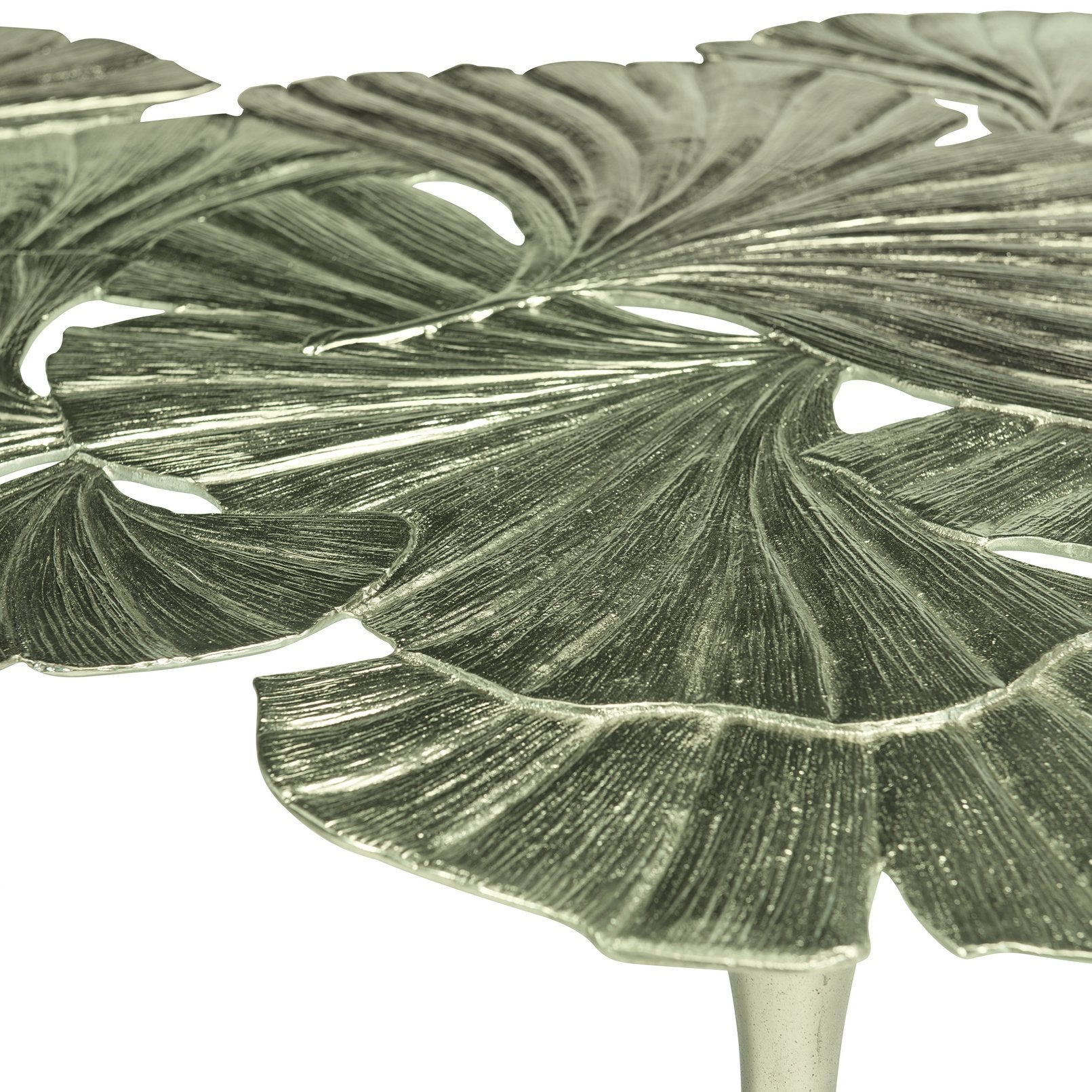 Evoking the graceful silhouette of ginkgo leaves, this Annabella cocktail table blends sculptural artistry with luxury finishes for a refined centerpiece that anchors contemporary living rooms. Its cast aluminum construction and satin nickel finish create a soft, luminous presence, while slender tapered legs and spade feet provide stable yet airy support—perfect for spaces that favor modern elegance with organic inspiration.