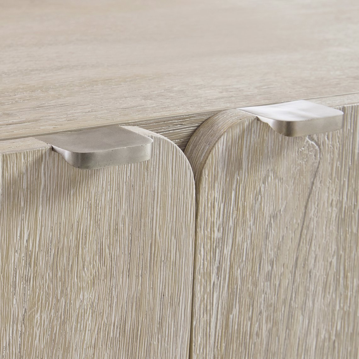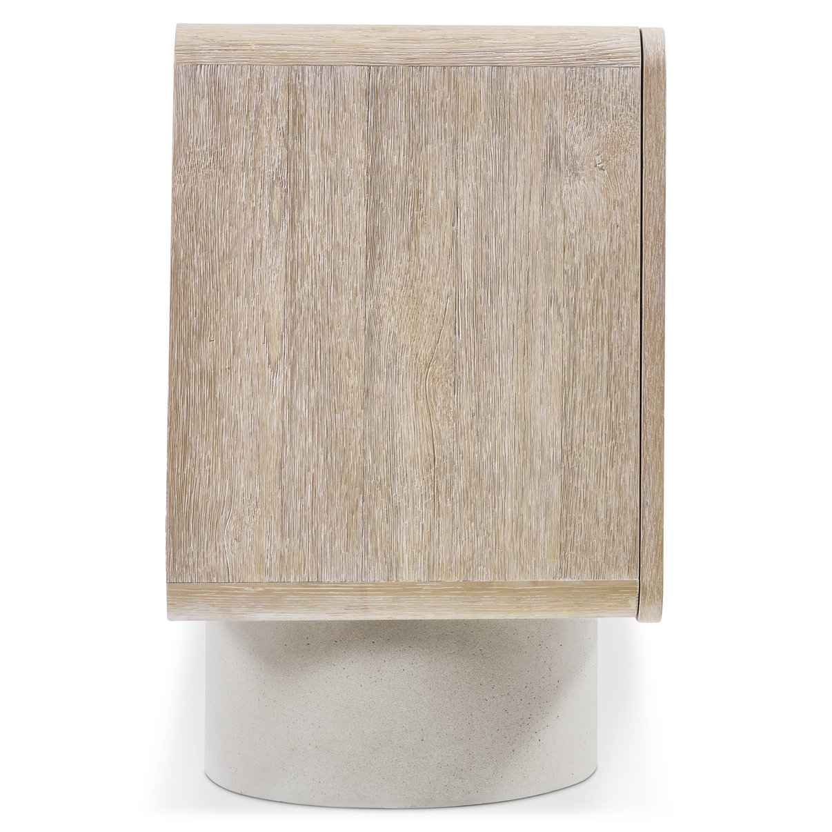 - Materials & Finishes: Rustic oak case in Roz finish; two round pedestals in glass-reinforced concrete with a slight pitted texture in Pumice finish; cast aluminum tab pulls in Graphite finish