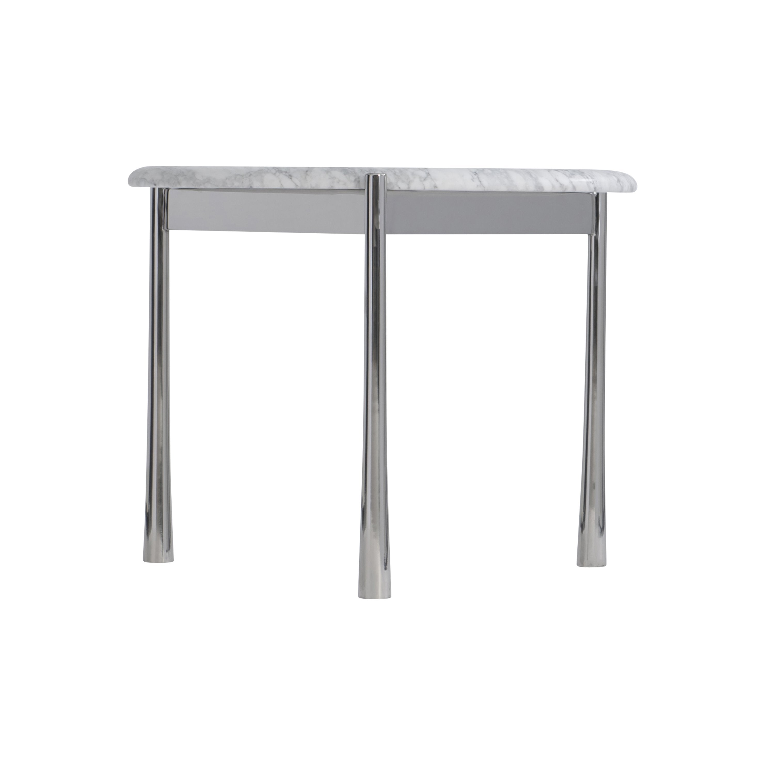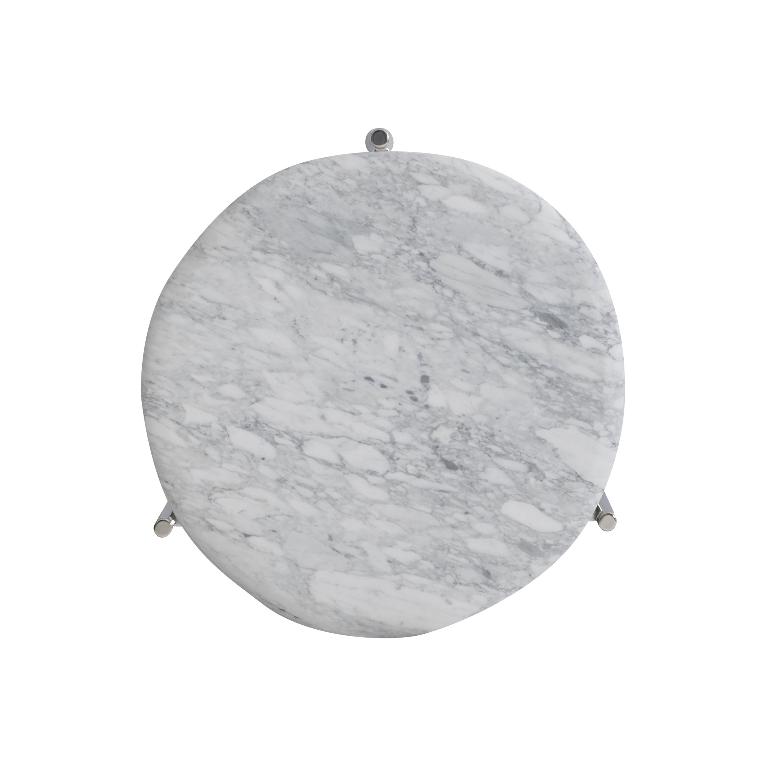 Discover the elegant balance of organic form and refined craftsmanship with this Arris side table. Its uniquely shaped honed Arabescato marble top and sleek polished stainless steel base create a striking focal point that complements both contemporary and transitional interiors. Thoughtful details—like tapered tripod legs and adjustable glides—ensure stability and visual lightness, while the irregular round top adds character and movement to any living space.