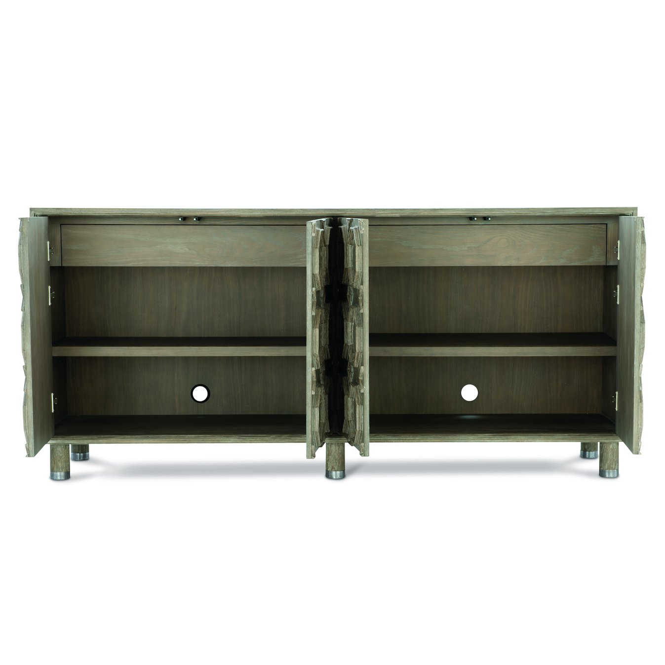 - Interior storage: Behind each pair of doors: one drawer with finger pull plus one adjustable/removable shelf for customizable organization