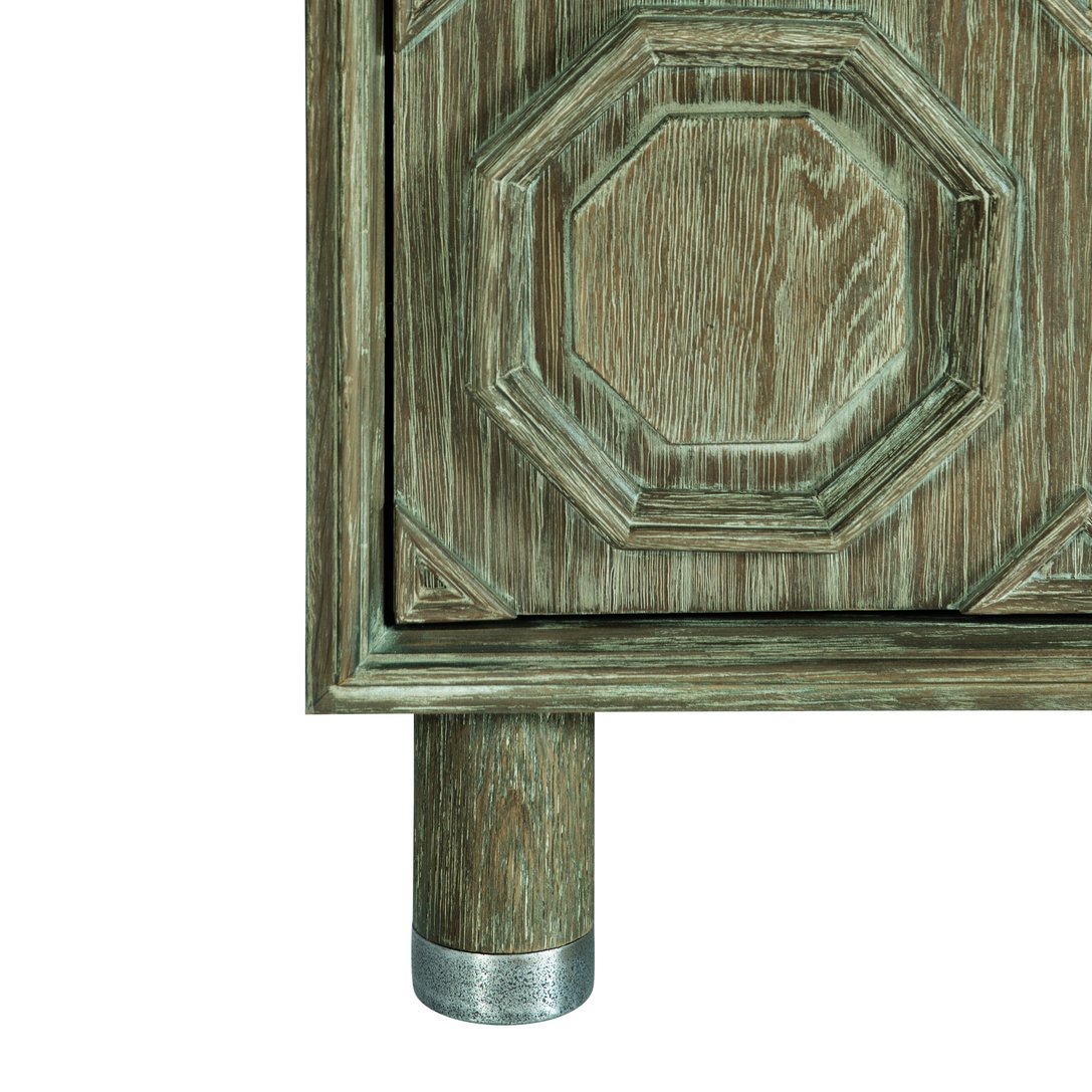 Elevate your living or dining space with this refined Art Deco–inspired storage credenza. Combining decorative marquetry, clean geometric lines, and a warm Aspen Oak finish, it delivers both striking visual appeal and practical organization. Thoughtful details—like carved patterned fronts, nickel-plated leg caps, and a mix of drawers and adjustable shelving—make it a versatile centerpiece for contemporary or transitional interiors.