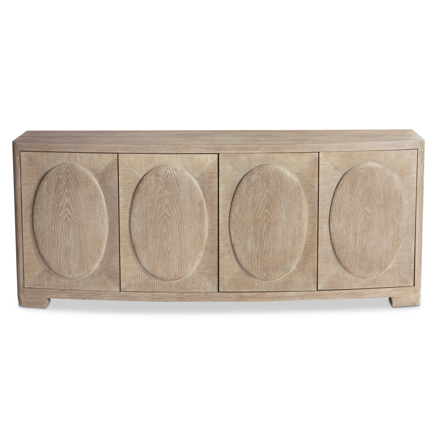 Elevate your dining or living room with this refined bowfront buffet that blends casual-traditional styling with thoughtful function. The Cameo door fronts and cathedral-cut white oak veneer create visual depth, while the Marcona finish delivers a warm, rustic character. Designed for everyday use, the buffet offers organized storage with soft-close hardware and flexible shelving to accommodate serving pieces, linens, and flatware.