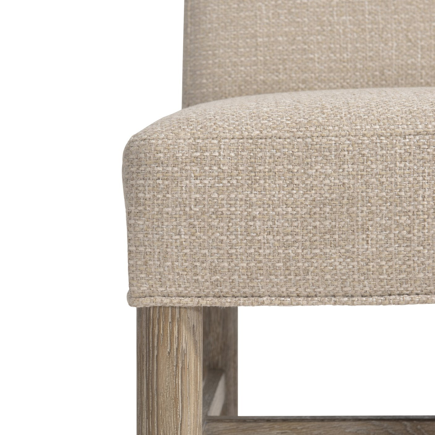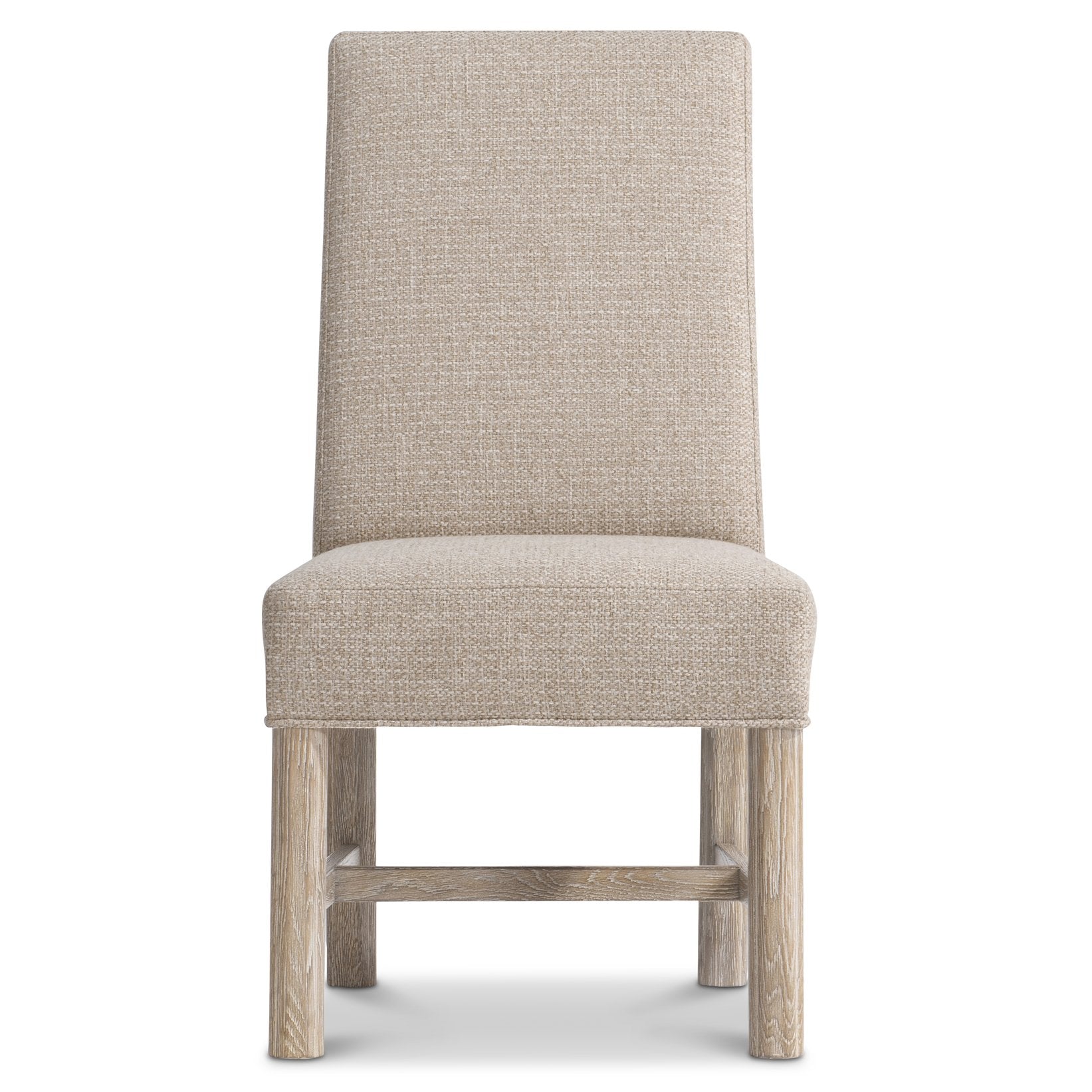 The Aventura side chair blends traditional silhouette with refined craftsmanship to bring both comfort and style to dining or living spaces. Fully upholstered for a tailored look, its straight-lined seat and back are balanced by textured round legs finished in warm Marcona, creating a versatile piece that complements casual-traditional interiors.