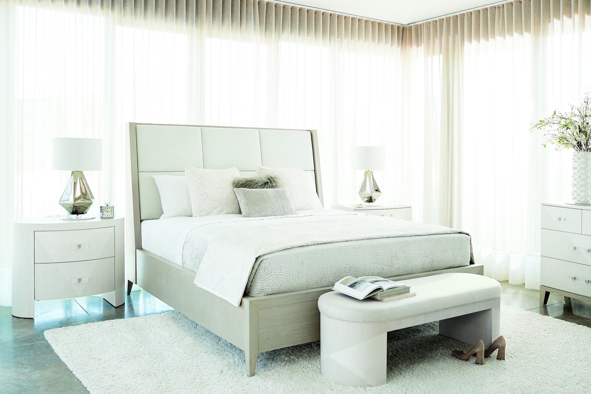 Elevate your bedroom with the Bernhardt Axiom Oval nightstand — a modern, sculptural piece that blends warm materials and refined details for a luxe yet approachable look. Its softly curved front and inverted pyramid motif create visual interest while maintaining a streamlined silhouette, and the combination of engineered faux anigre veneers, poplar solids, and acrylic-accented hardware gives the piece a fresh, contemporary presence that complements a variety of decor styles.
