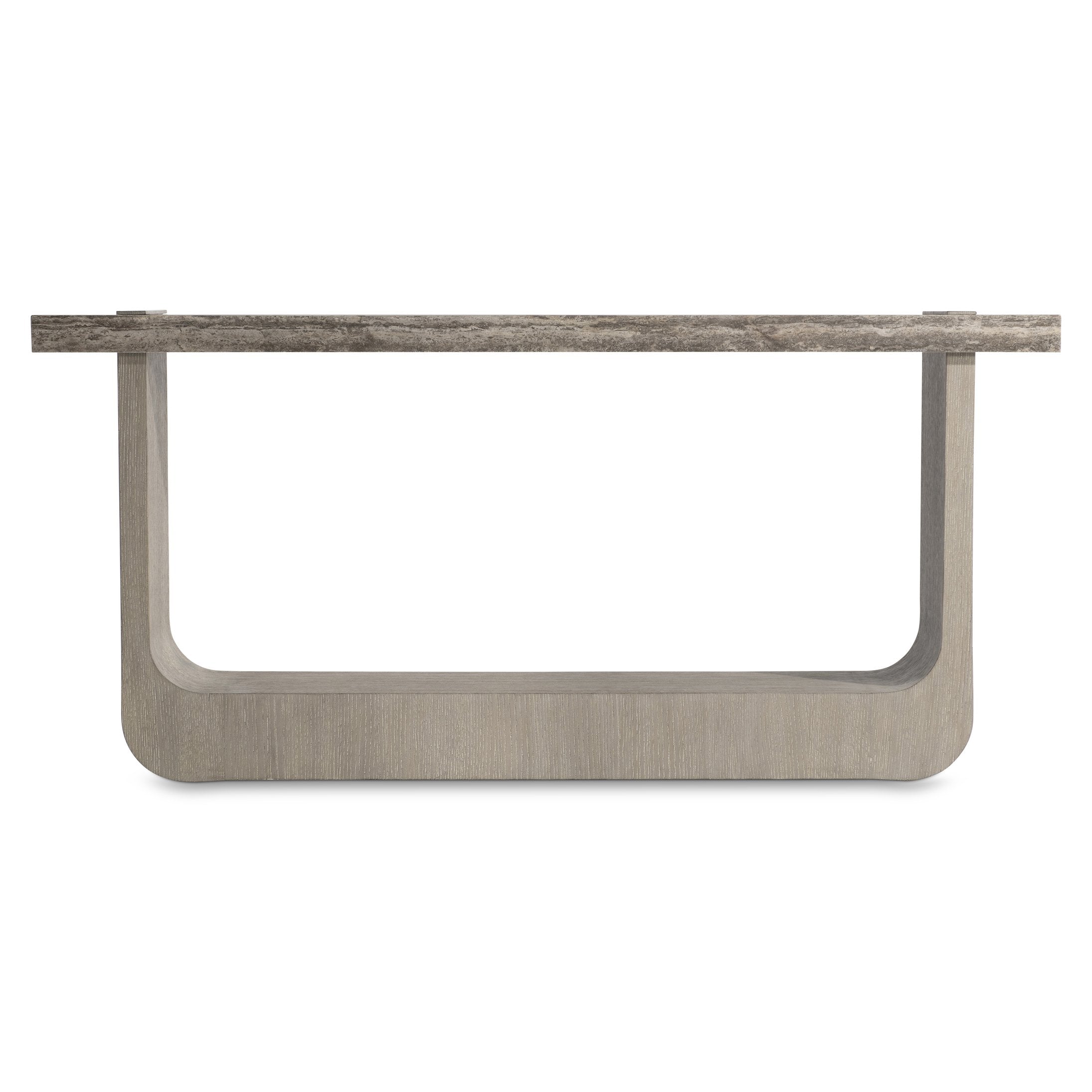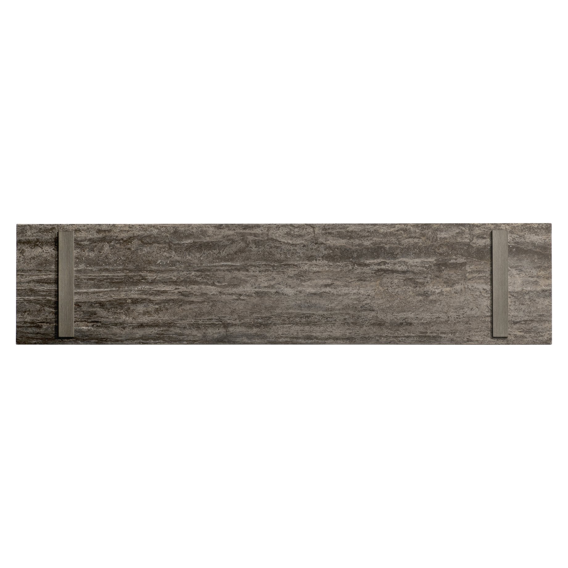 - Honed silver travertine table top, supported by base of oak solids and veneers in Weathered Greige finish