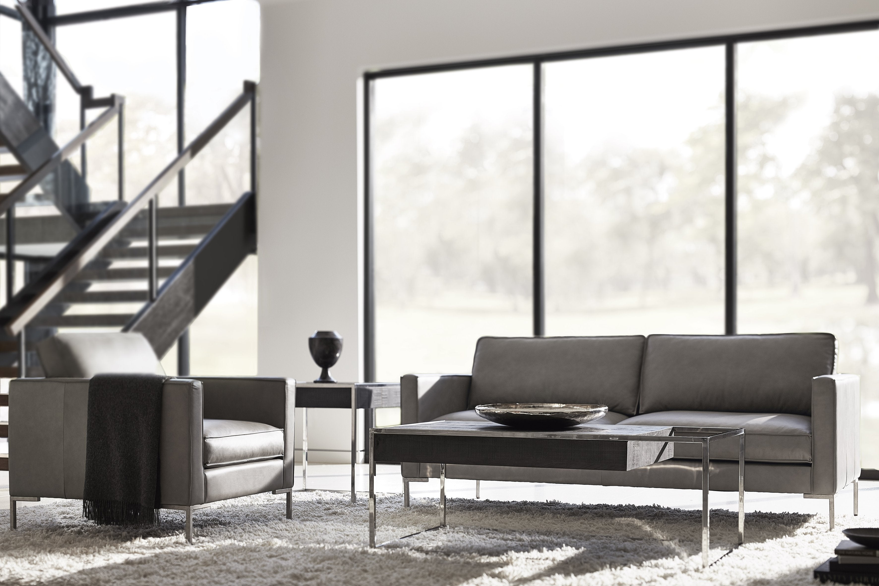 Tubular stainless steel frame with suspended, off-centered wood box in Cinder finish Adjustable glides