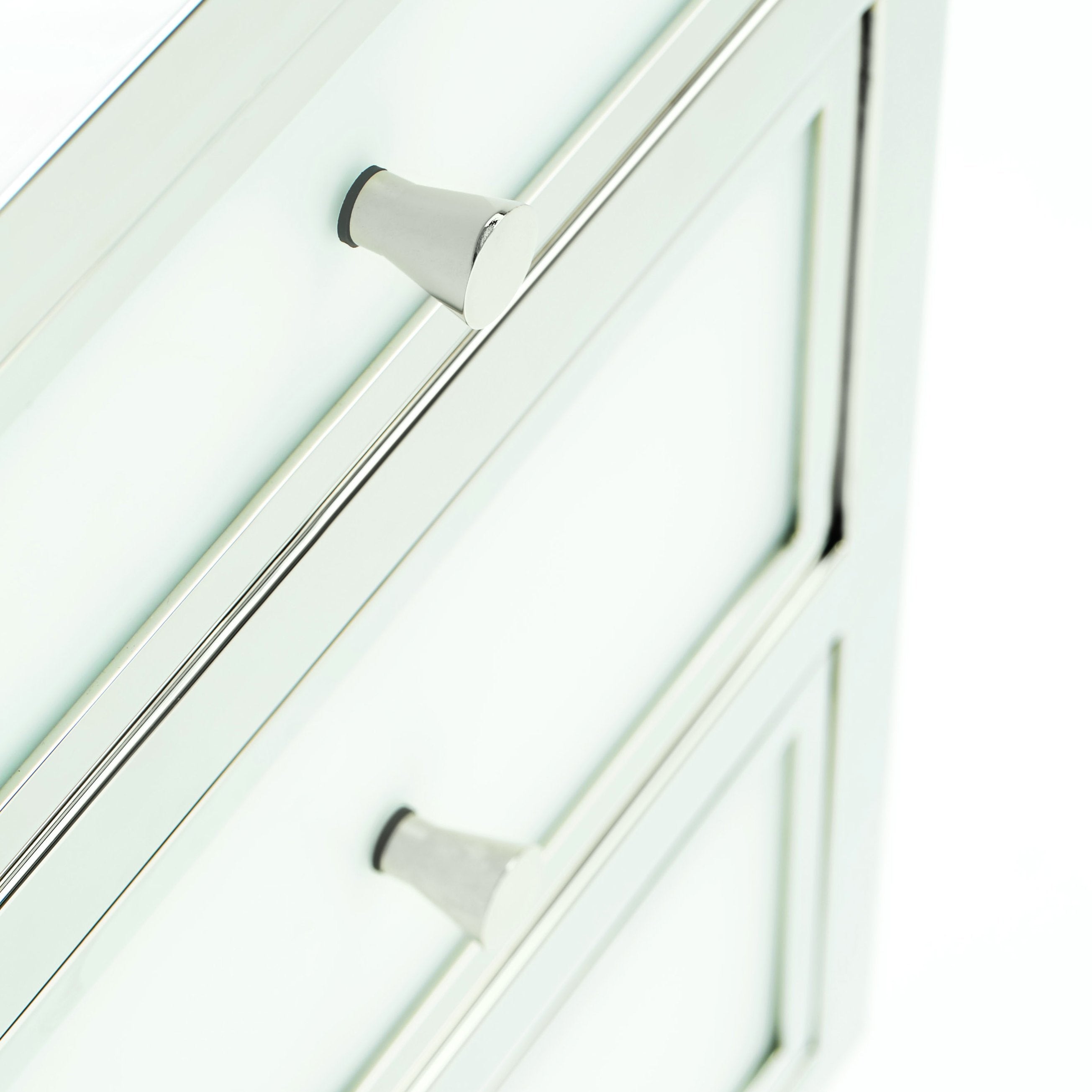 Solid and tubular polished stainless steel. Inset Snow glass on top, end panels and drawer fronts. Three drawers with white painted interior. Adjustable glides. Anti-tip kit.
