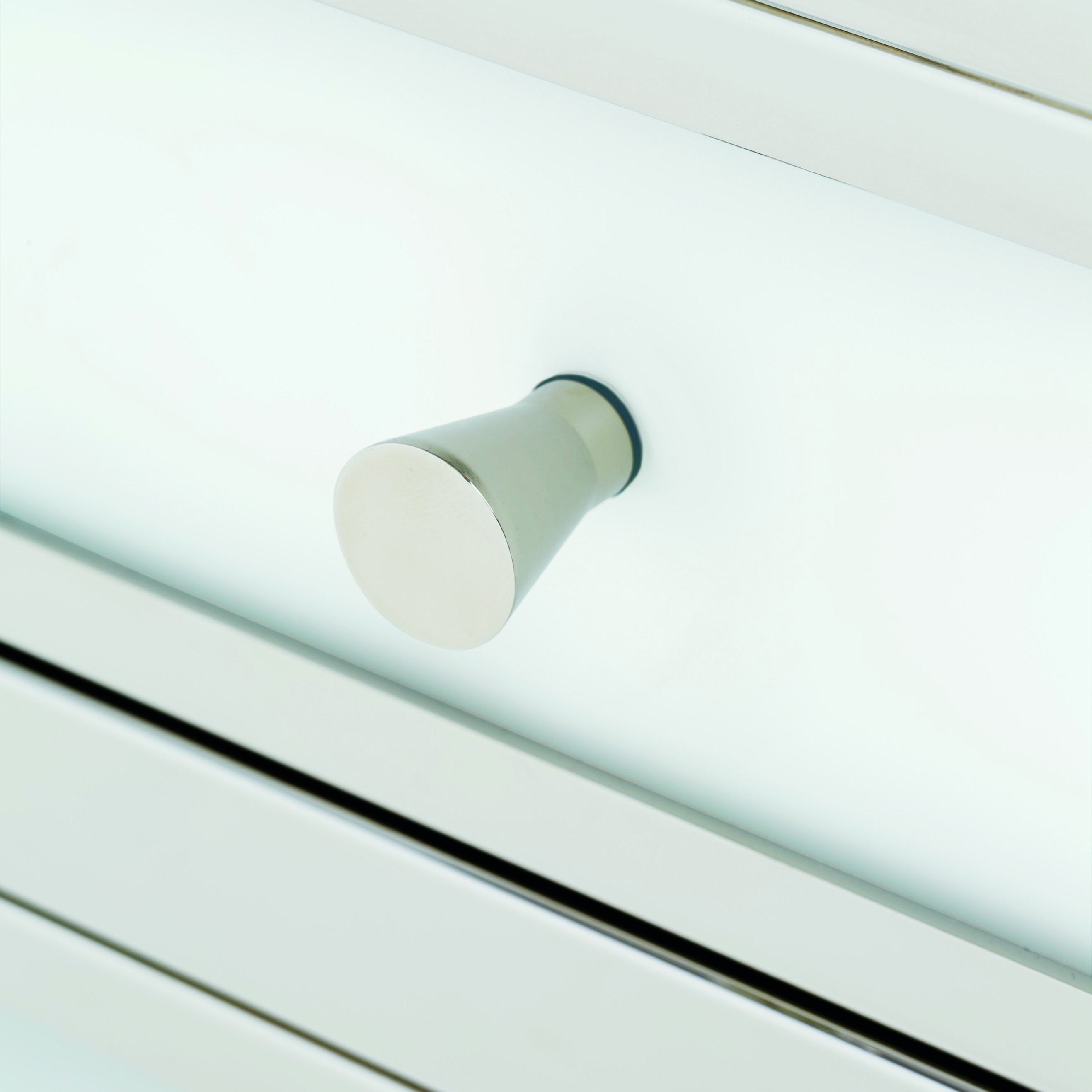 A chic fusion of modern glamour and functional design, this nightstand brings bright, sculptural presence to any bedroom. Clean lines, polished stainless-steel framing, and inset snow glass create a refined, contemporary look while three spacious drawers with white-painted interiors provide organized, everyday storage.