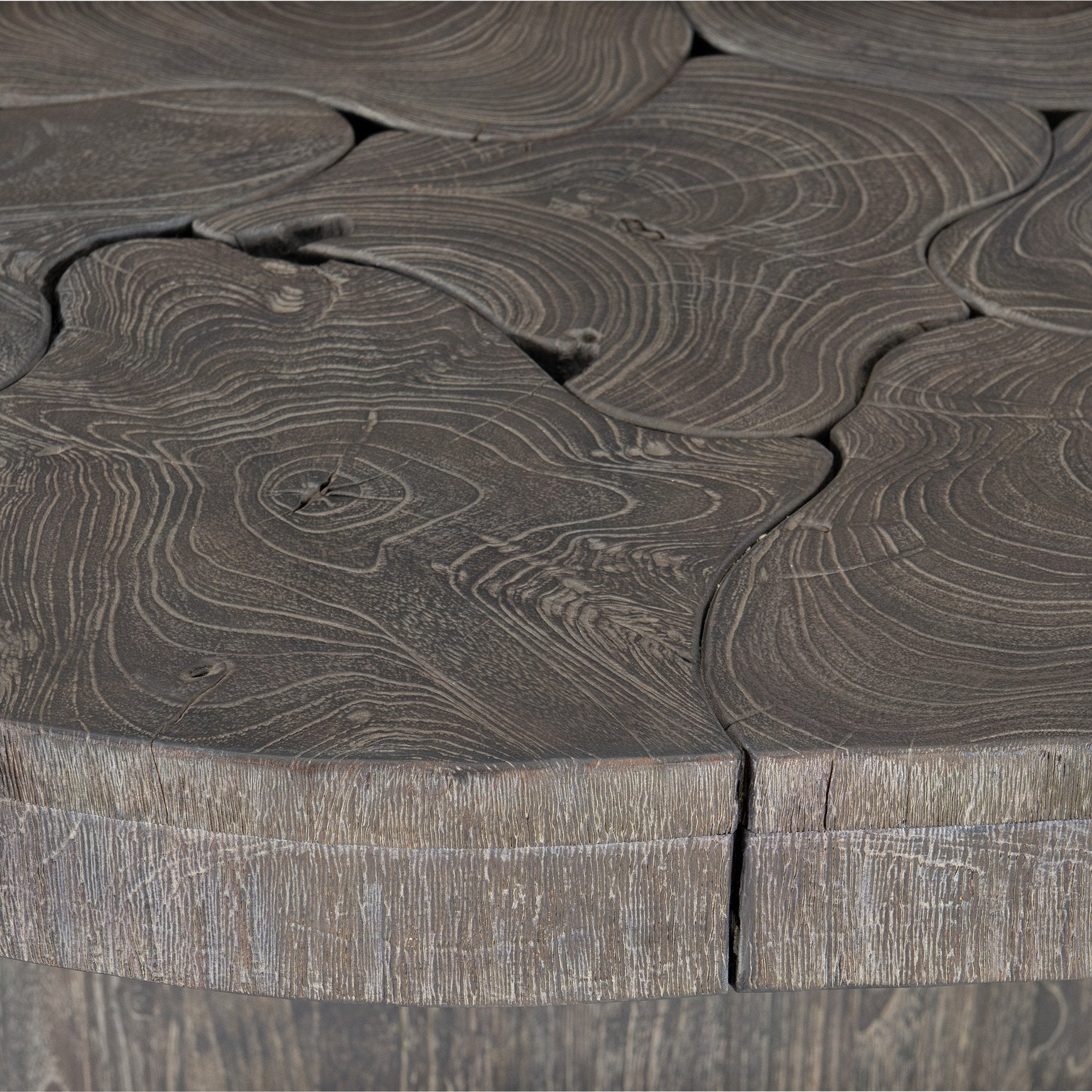 Bring natural warmth and modern craftmanship to your outdoor dining area with this artfully designed table. Its carbonized sliced teak top—assembled from uniquely shaped pieces—creates a one-of-a-kind puzzle-like surface with a rustic yet refined appearance, while durable metal supports and weather-resistant finishes ensure long-lasting outdoor performance.