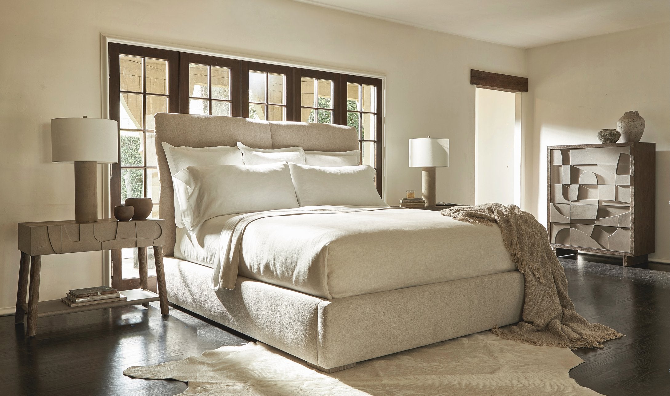 - Materials & Finishes: Bedrock faux concrete finish on the drawer front and shelf; Playa finish on the top, case, legs, and finished back