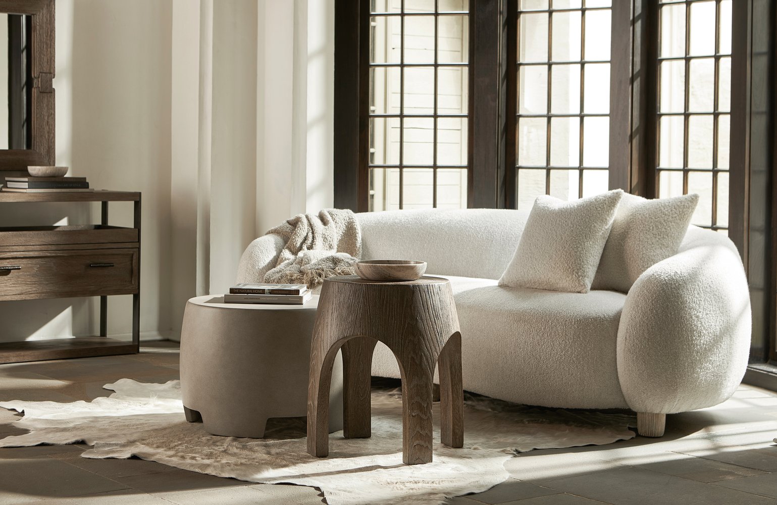Inspired by natural forms and refined for contemporary interiors, this Casa Paros side table combines sculptural presence with practical function. The drum-like silhouette and cutout arched legs create a striking profile, while the Playa finish and end-grain pattern lend tactile warmth that complements rustic-modern and transitional spaces.
