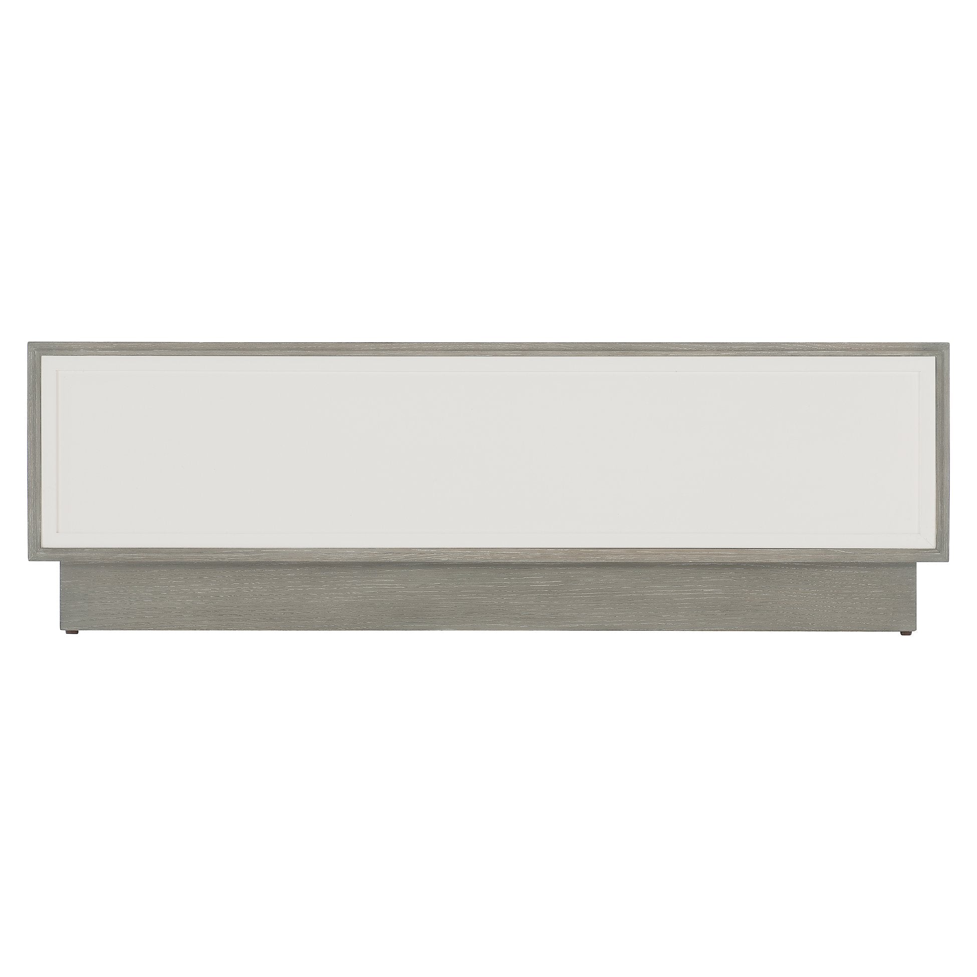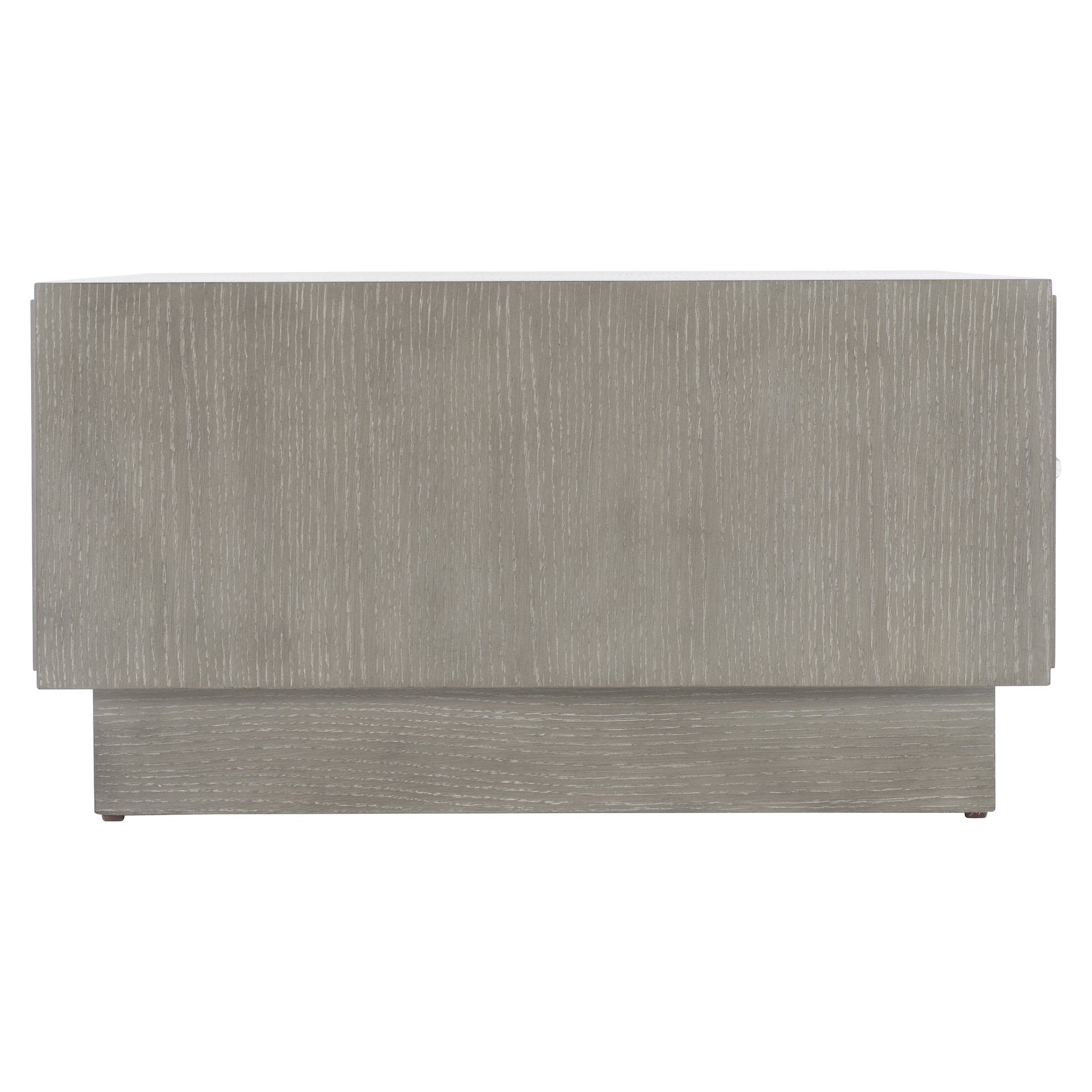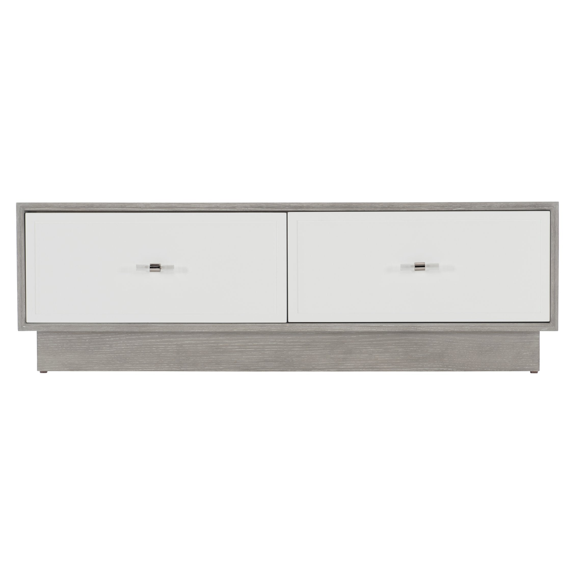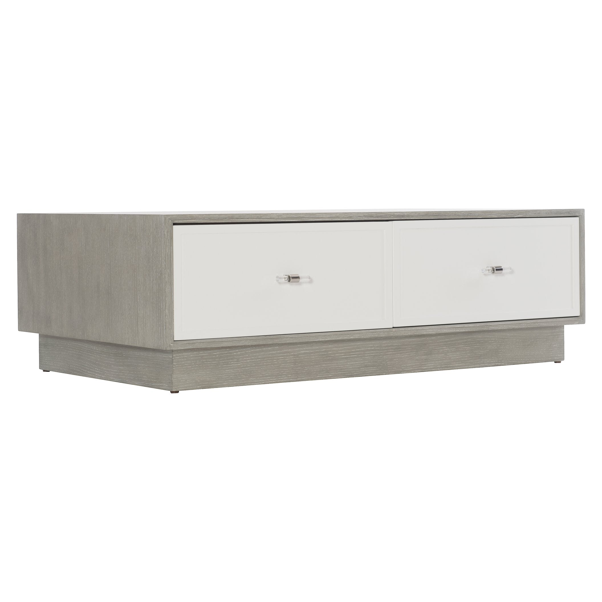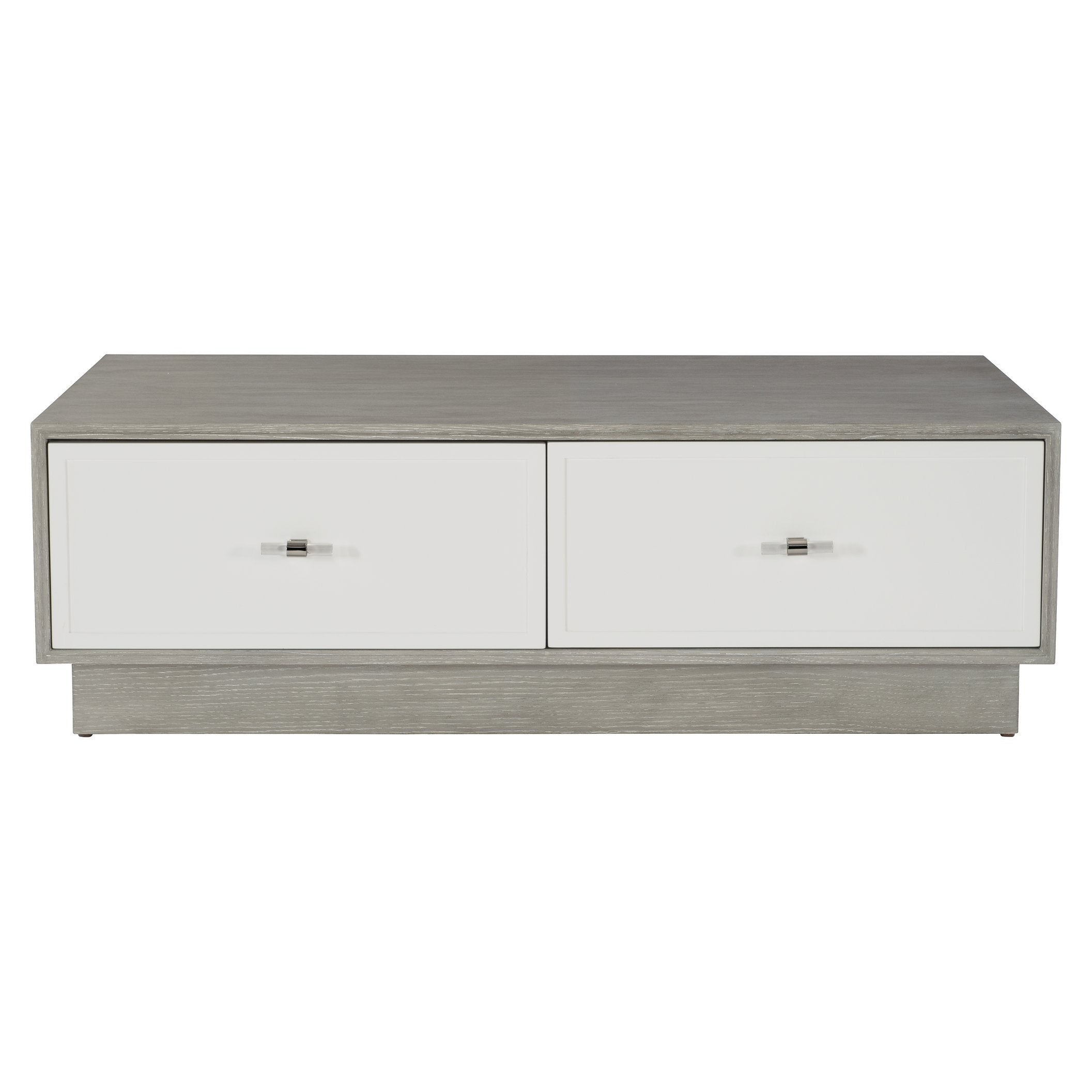 Clean, refined, and quietly luxurious, this cocktail table channels mid-century modern aesthetics with a contemporary sensibility. Its geometric silhouette, cerused greige oak veneer, and contrasting lacquered-white drawer fronts create a balanced focal point for living rooms seeking both style and storage. Thoughtful details—like soft-closing drawers, lucite and polished stainless-steel hardware, and casters—make the piece as practical as it is elegant.
