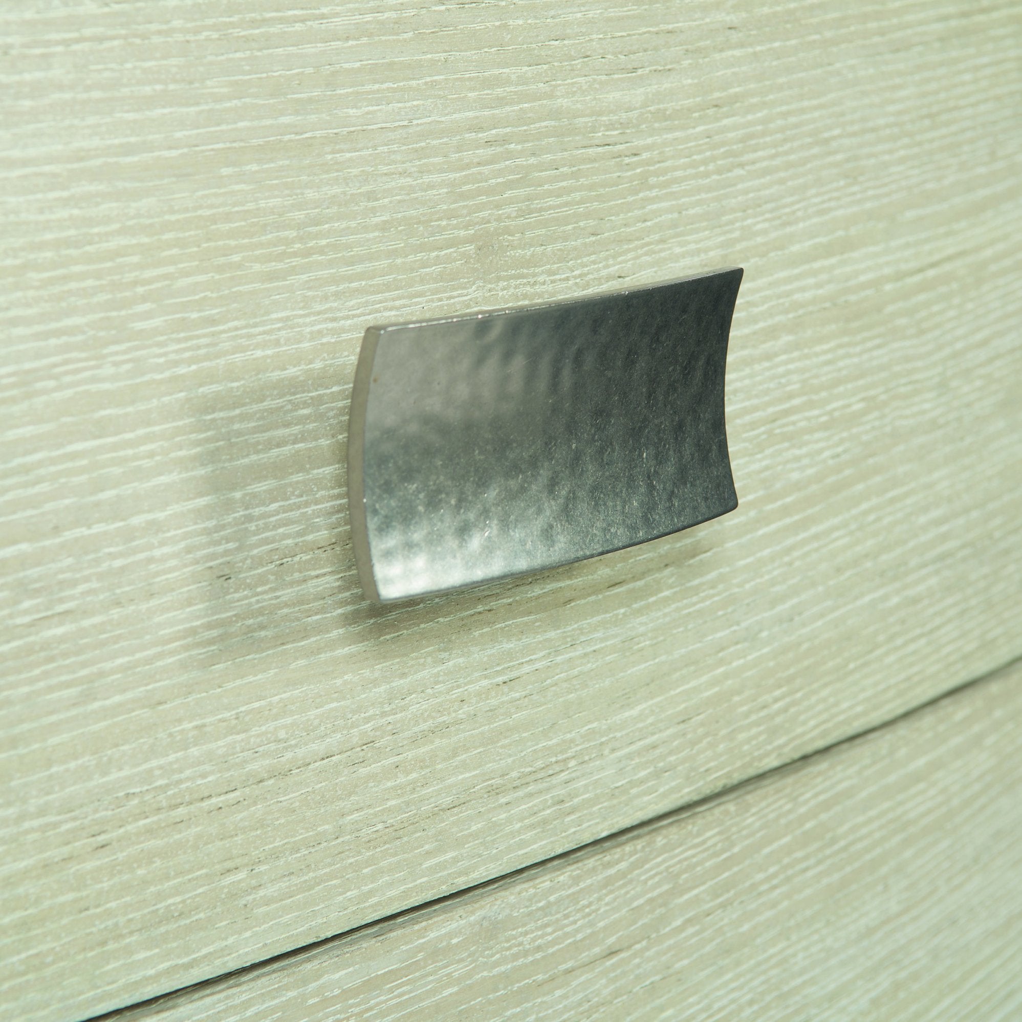 - Hardware: Die-cast nickel-plated zinc pulls with an Aged Silver finish, shaped in gentle concave rectangles