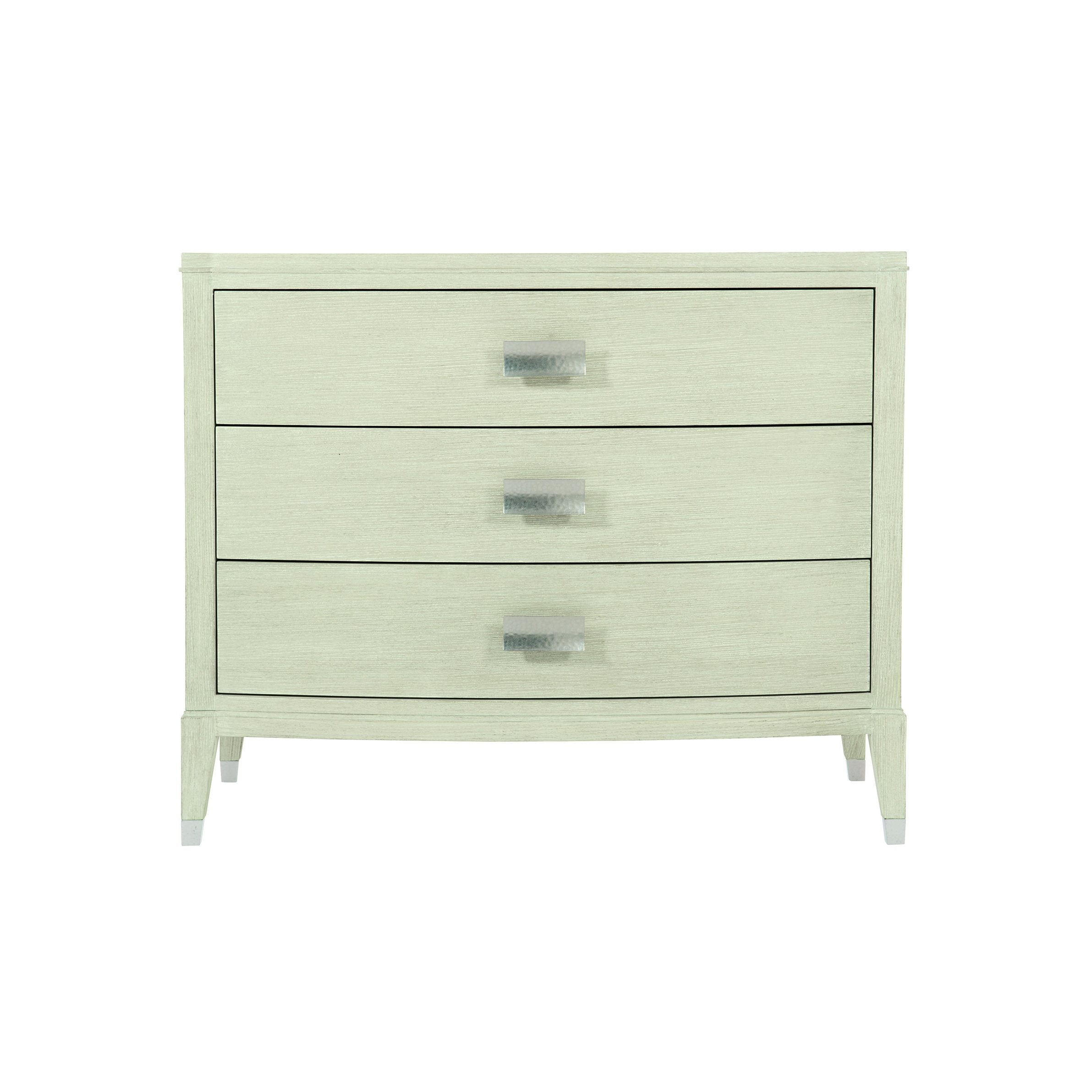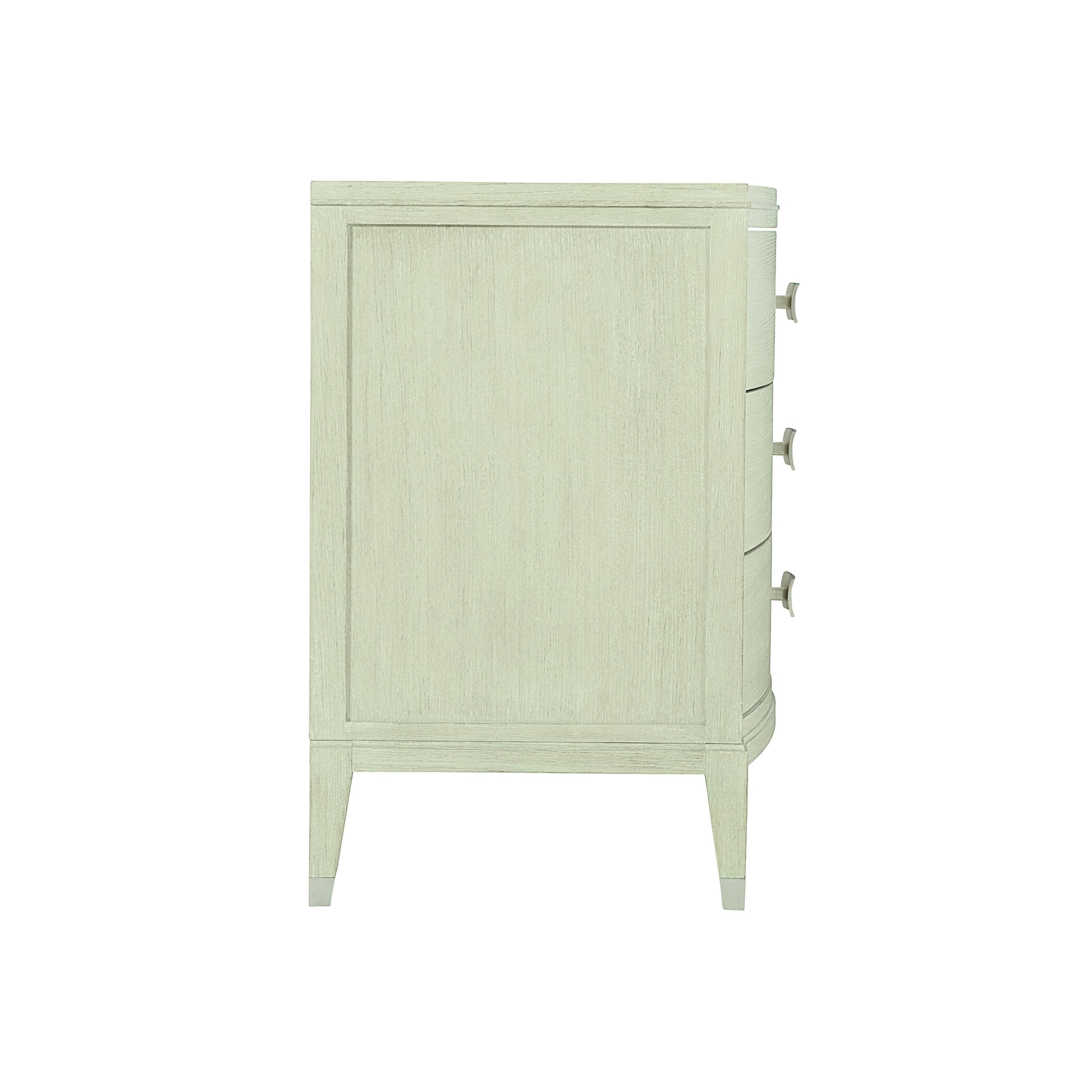 Invite quiet elegance into your bedroom with this refined three-drawer nightstand. The piece blends minimalist proportions with handcrafted details — a Cerused Linen finish accentuates the quartered ash veneers while subtle hardware and metal accents add texture and sophistication. Designed for everyday function, it pairs timeless form with practical storage.