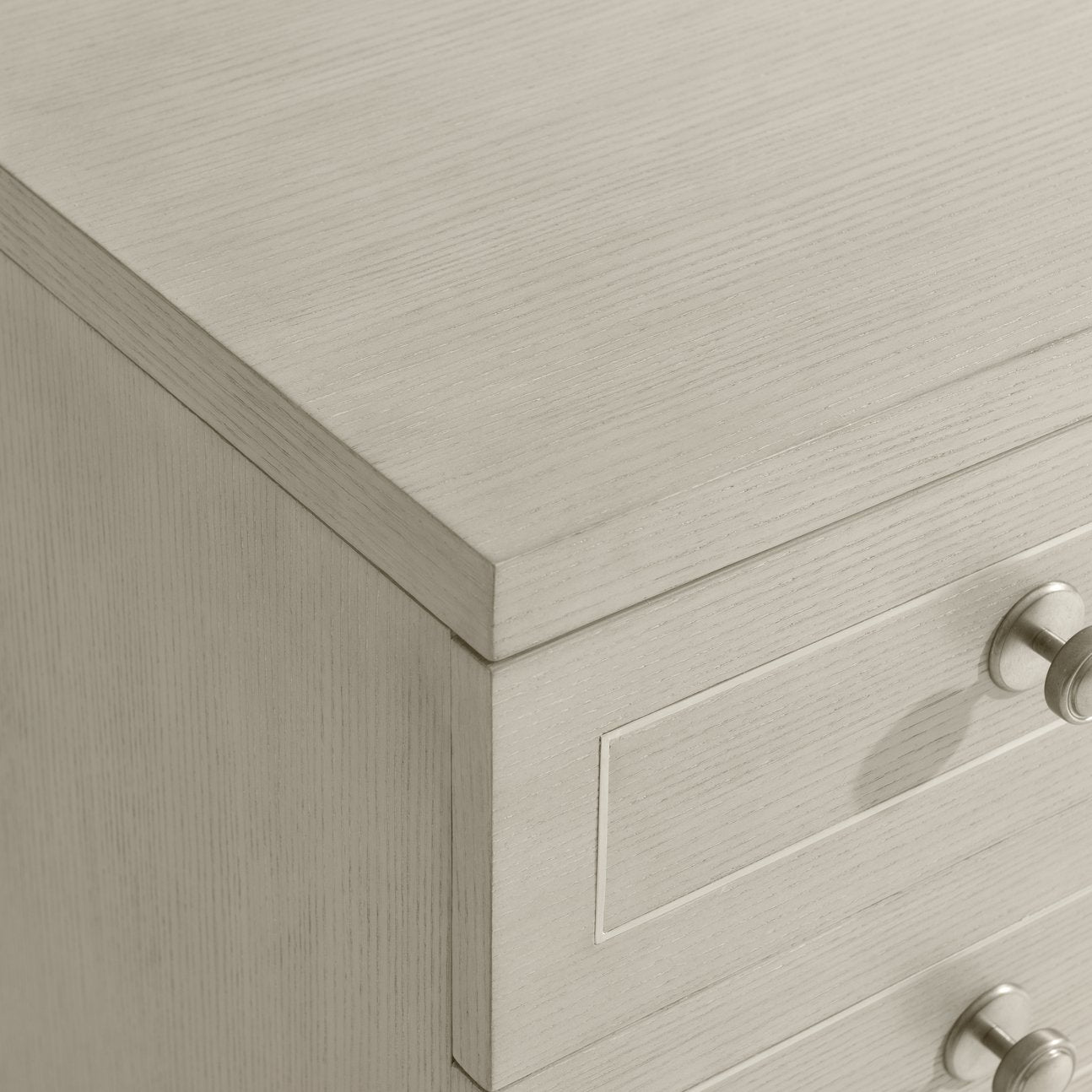 - Finish & Materials: Nebbia ash wood finish with brushed stainless steel metal inlays and glazed stainless steel drawer pulls for a polished, layered look.