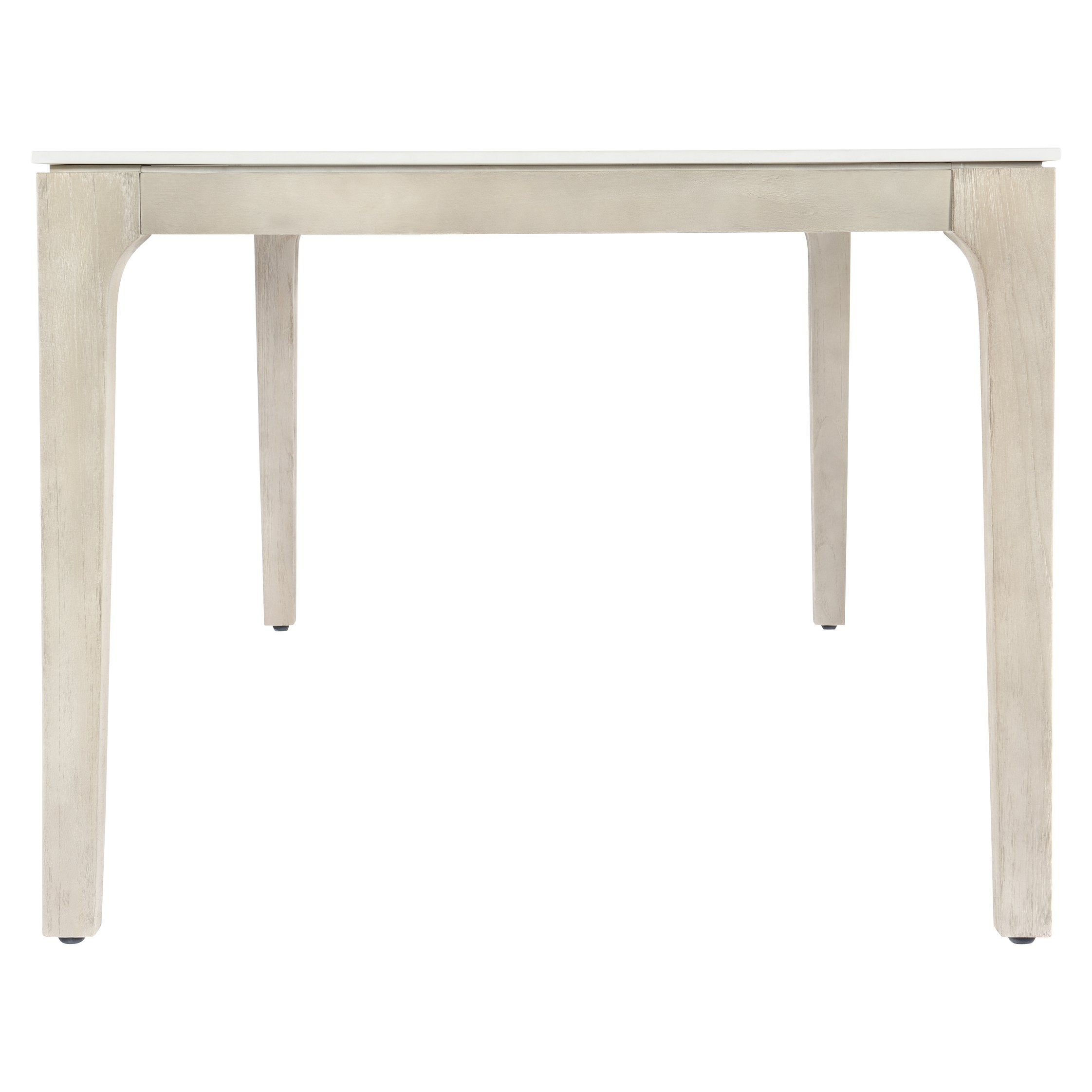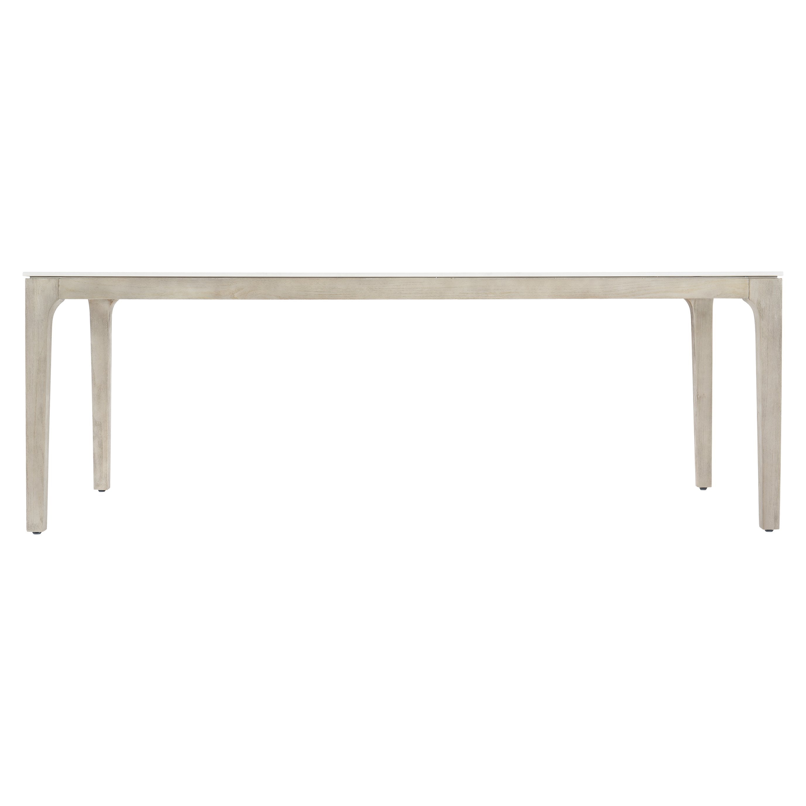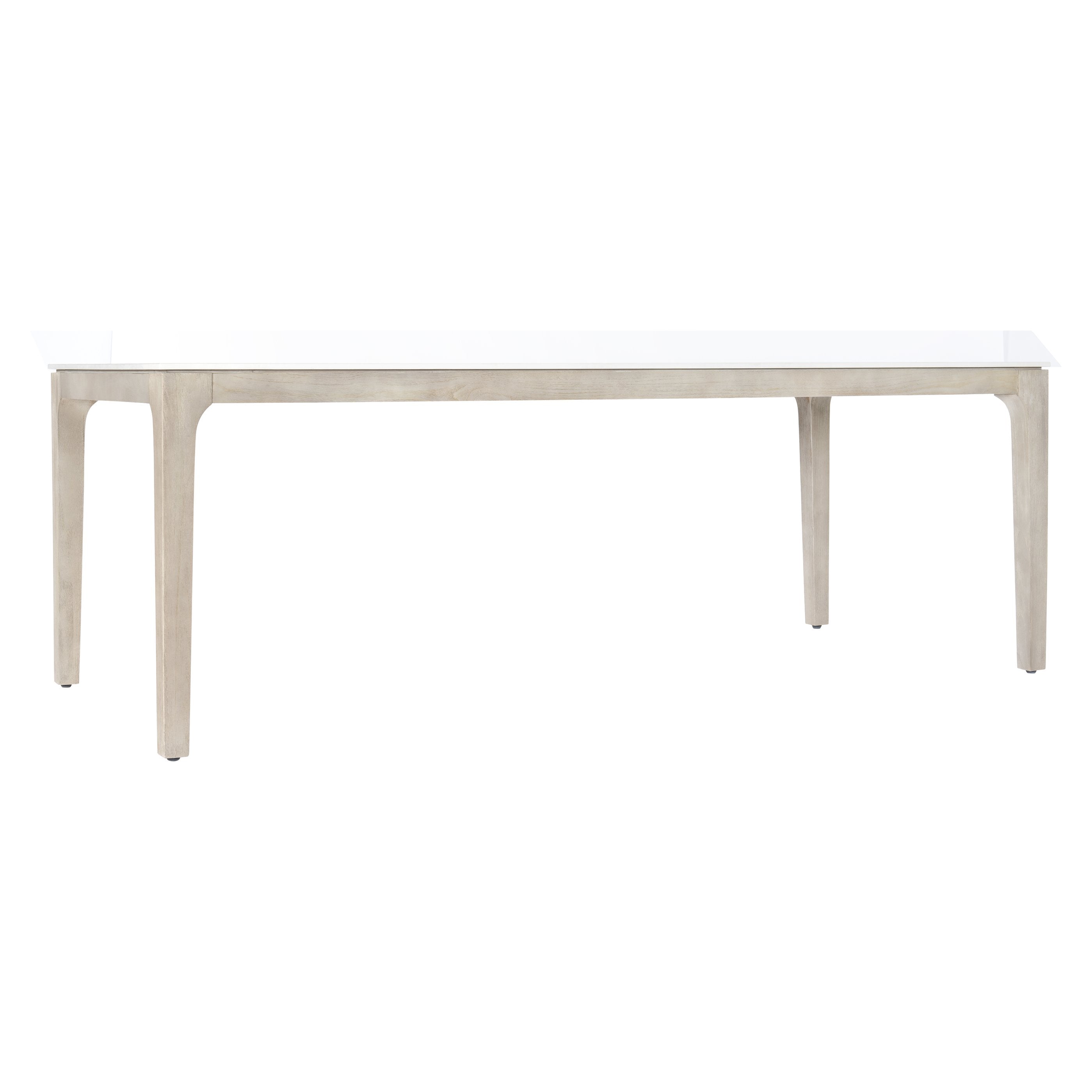 Extremely durable rectangular Dekton top of processed natural stone in Matte Shell White finish. Solid Teak base in Sun Washed finish. Stainless steel bolts and inserts and adjustable glides with stainless steel threads and inserts.