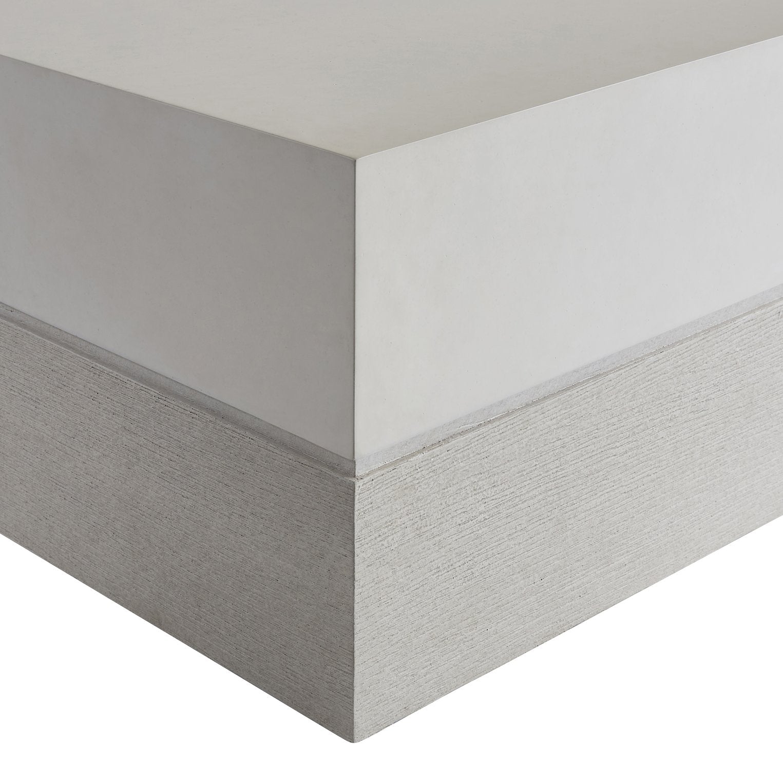 - Pitted faux stone in Adobe finish on top section, quartered ash wood reveal and bottom section in Sandblasted White finish