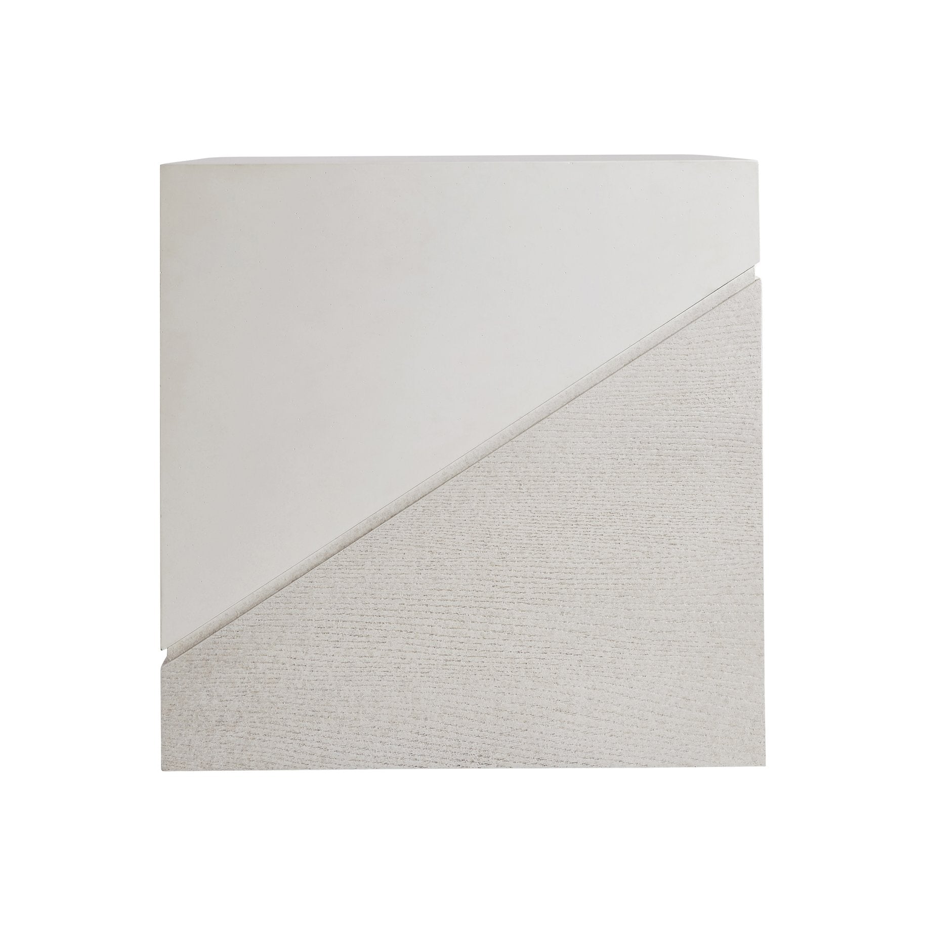 A striking blend of minimalist form and refined materials, this side table brings sculptural presence and practical surface space to living rooms, bedrooms, or entryways. Clean, uncomplicated lines and contrasting textures—pitted Adobe faux stone on top paired with a sandblasted white base—create a sophisticated focal point that complements modern and transitional interiors.