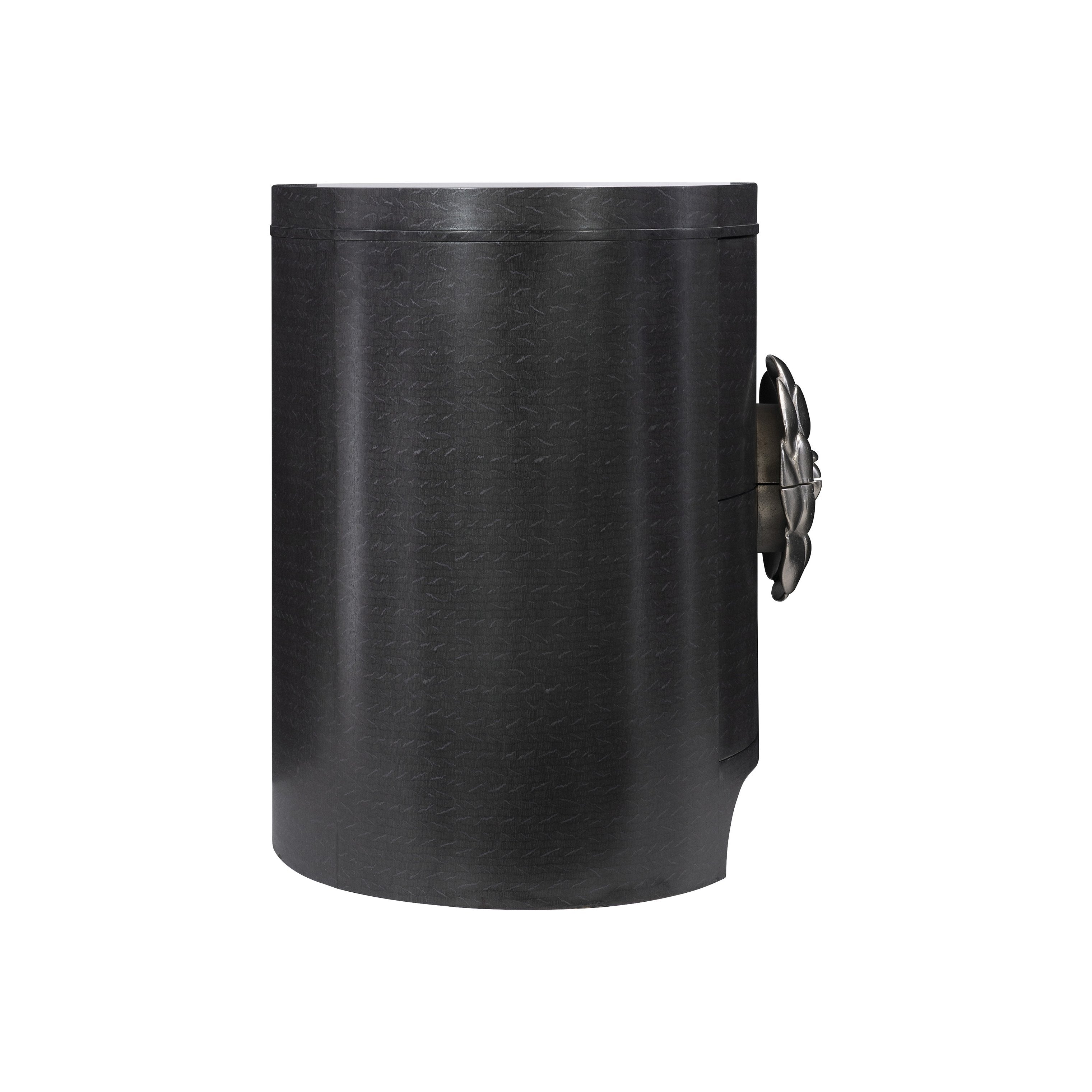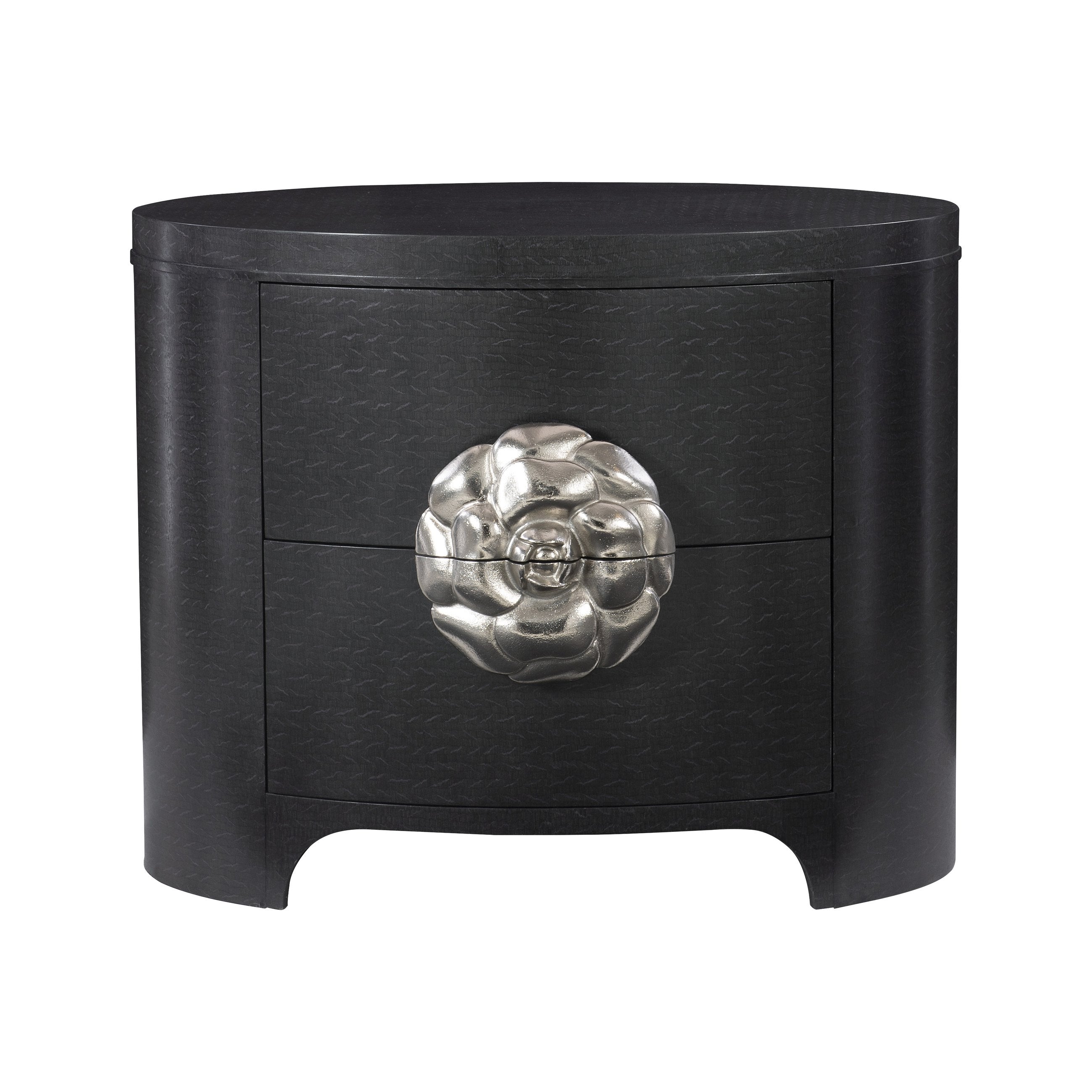 Elevate your bedroom with a piece that blends Hollywood Regency glamour and modern tailoring. This nightstand pairs sculptural form with refined materials—offering a striking focal point while providing practical storage and quiet functionality. Its figured anigre wood veneer, soft-close drawers, and signature camellia-shaped hardware create a cohesive look that complements both transitional and contemporary interiors.