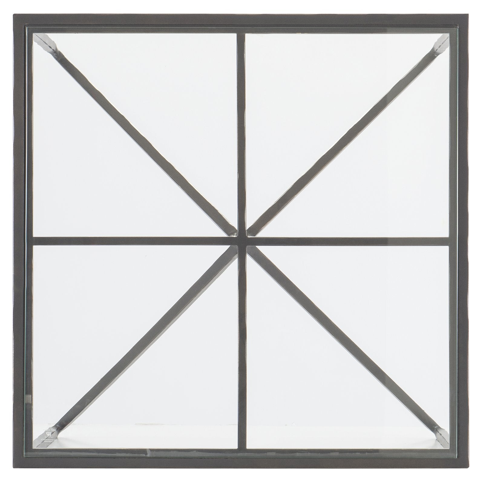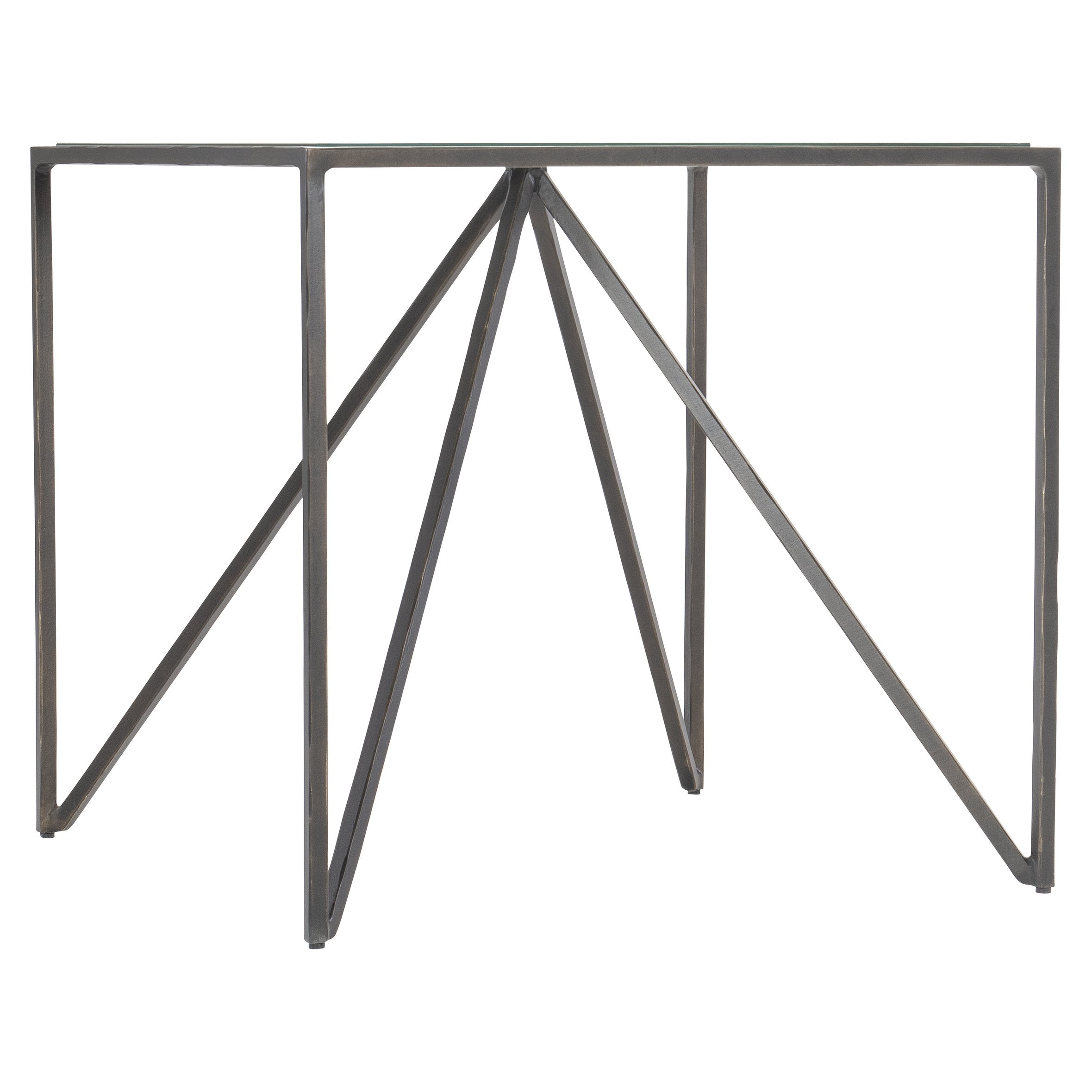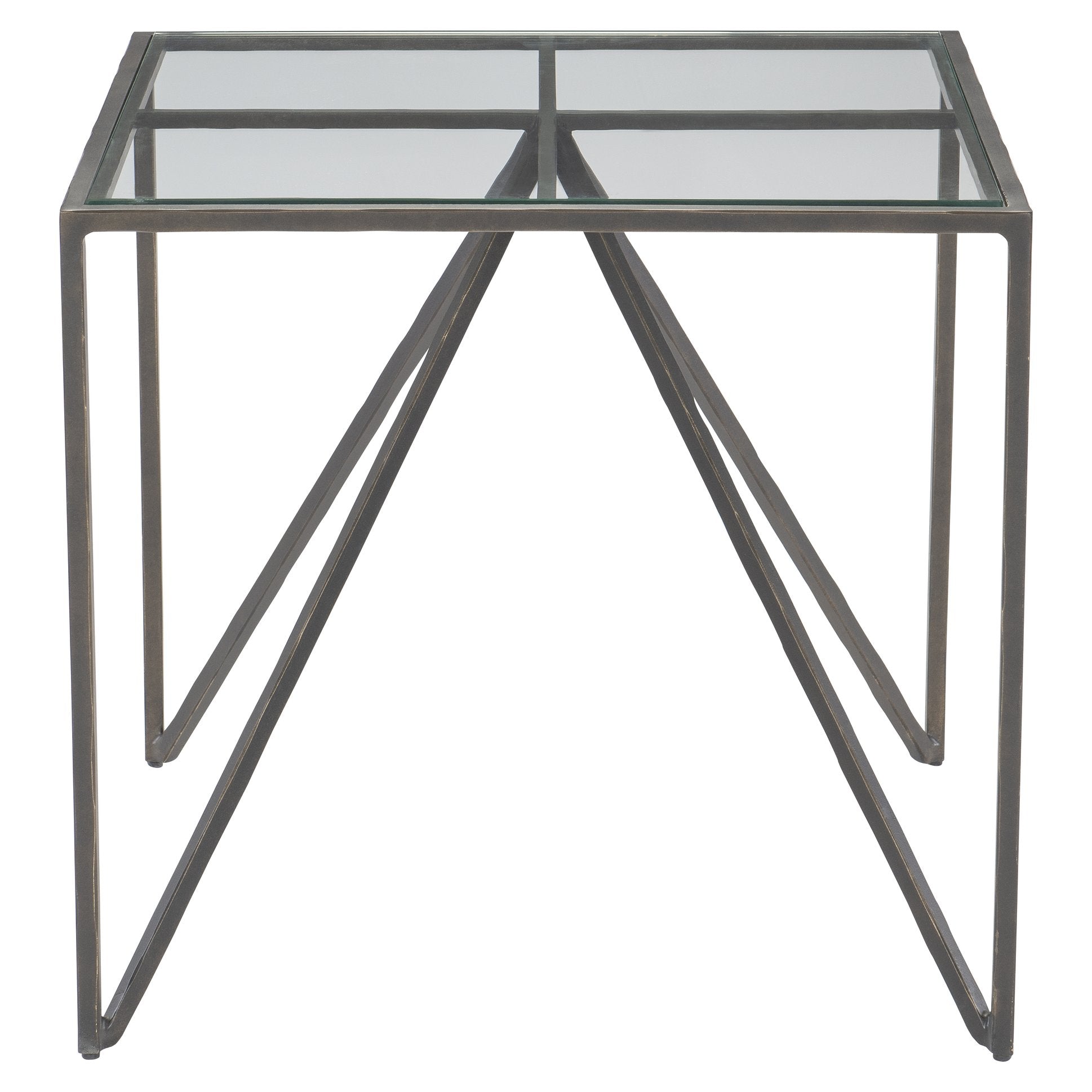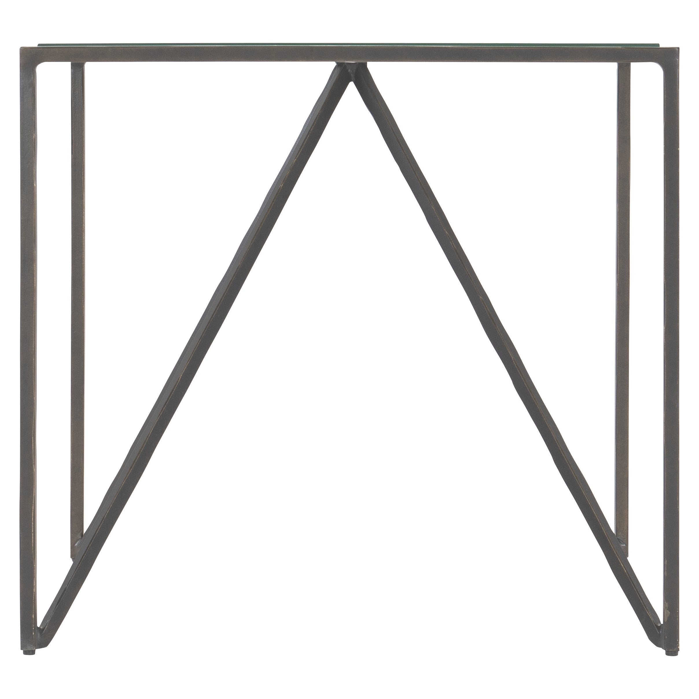 Square iron side table and stretchers with lightly hammered texture and New Aged Bronze finish. Inset tempered glass top. Small adjustable glides.