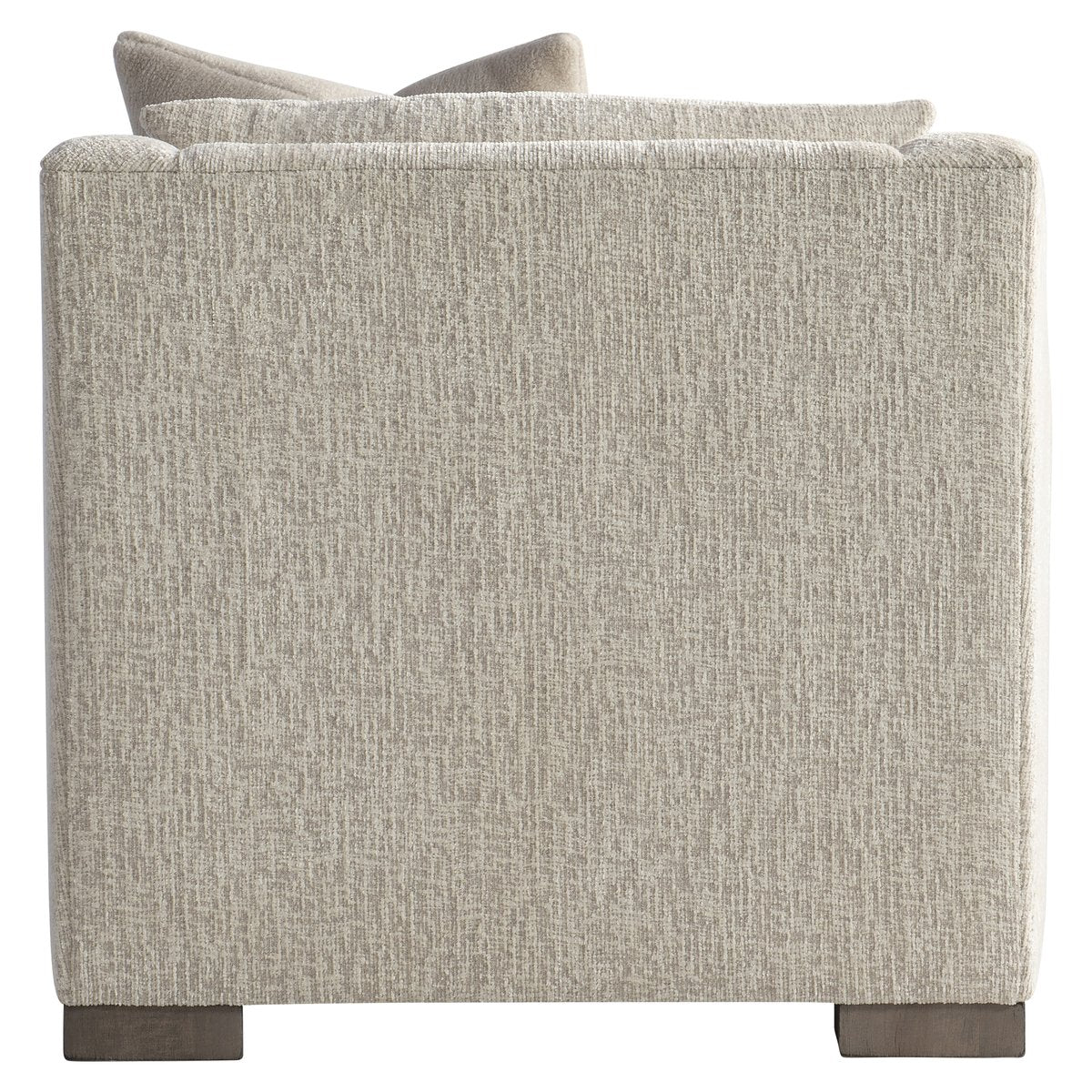 - Base: Exposed wood block feet provide stability and a refined contrast to the upholstery