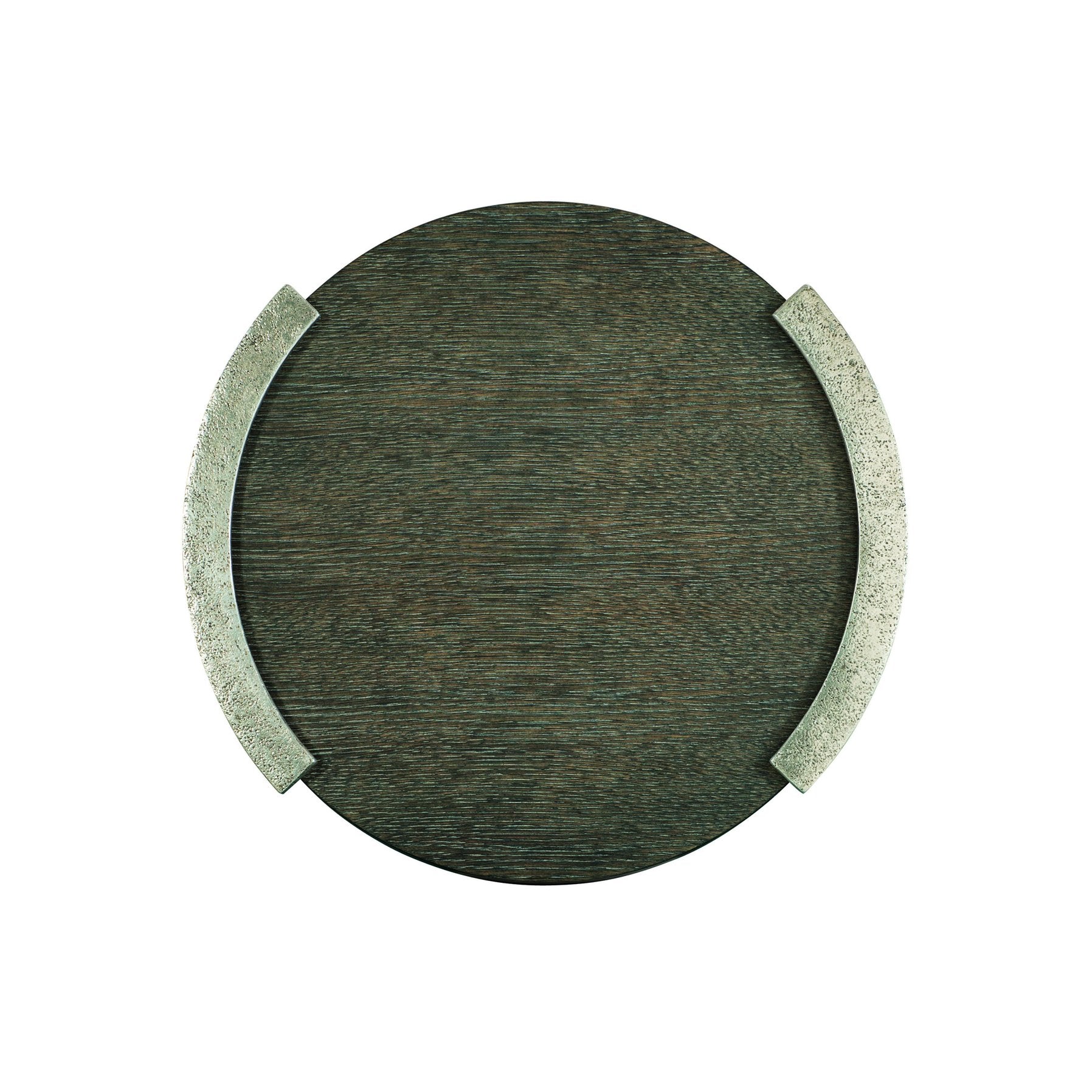 - Round top crafted from sandblasted oak veneers with a Weathered Charcoal finish that highlights natural wood grain and texture