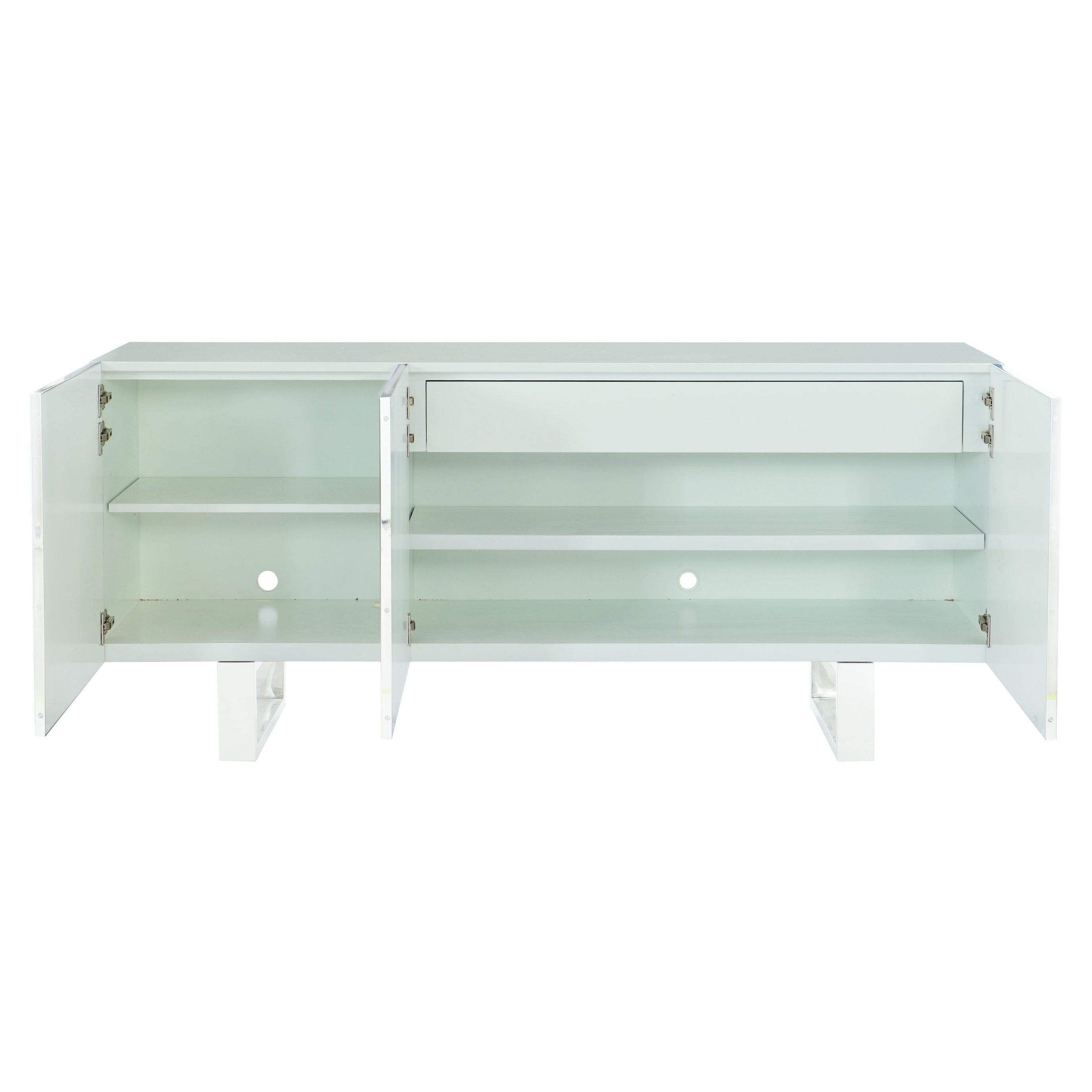 White finish. Three soft-closing doors with polished stainless steel frame with Capiz Shell panel in starburst pattern. Behind left end door is one adjustable/removable shelf and one grommet hole with cover for wire management. Behind paired center and right doors is one adjustable/removable shelf, one drawer and one grommet hole with cover in back panel for wire management. White painted interior. Two polished stainless steel open style legs. Adjustable glides. Anti-tip kit. Note: Felt tabs on doors,