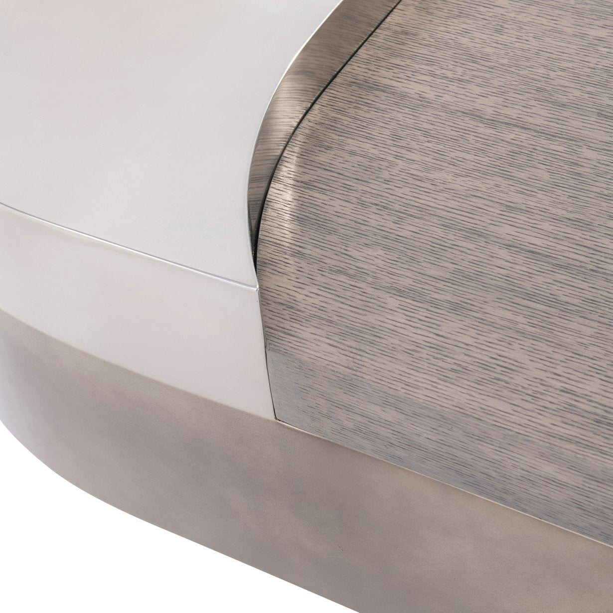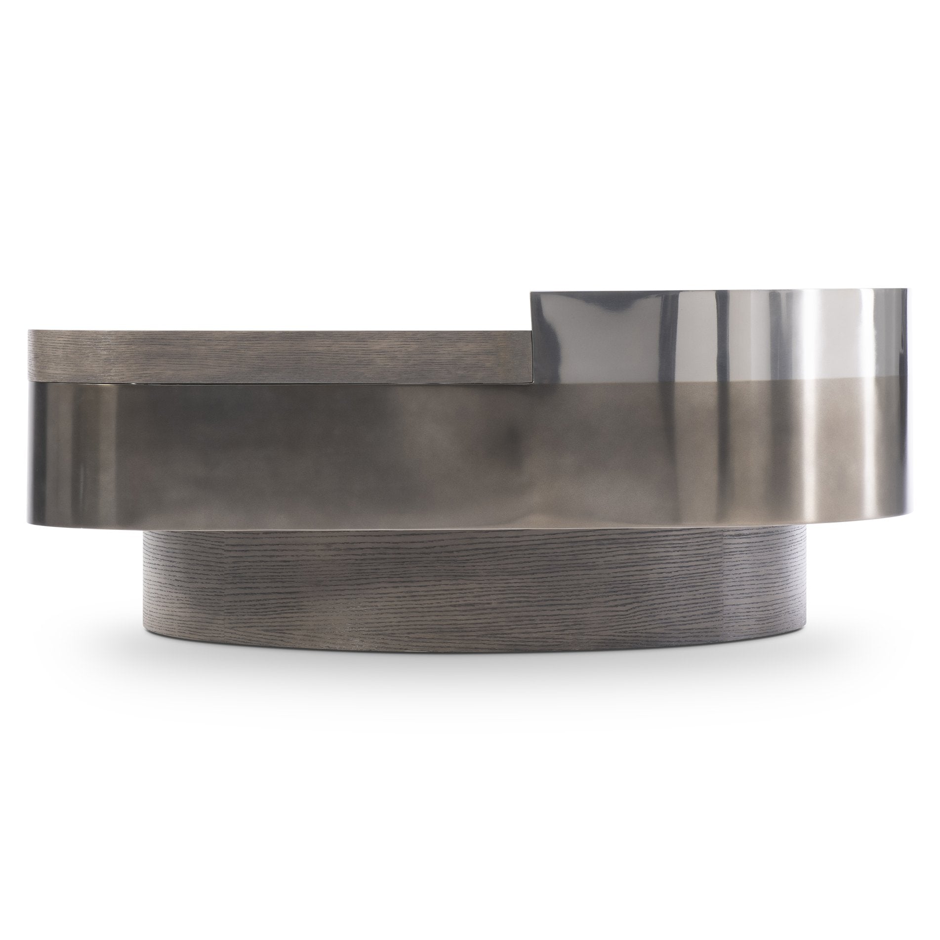 The Jacopo cocktail table blends sculptural modern design with warm, natural materials to create a striking centerpiece for contemporary living spaces. Combining layered stainless steel and wire-brushed oak, it delivers visual depth and fluid, curved silhouettes while providing practical surface area and storage.
