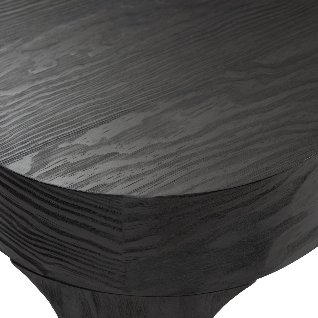 Blackened Pine finish. Semi-rectangular freeform cocktail table with four legs. Adjustable glides.
