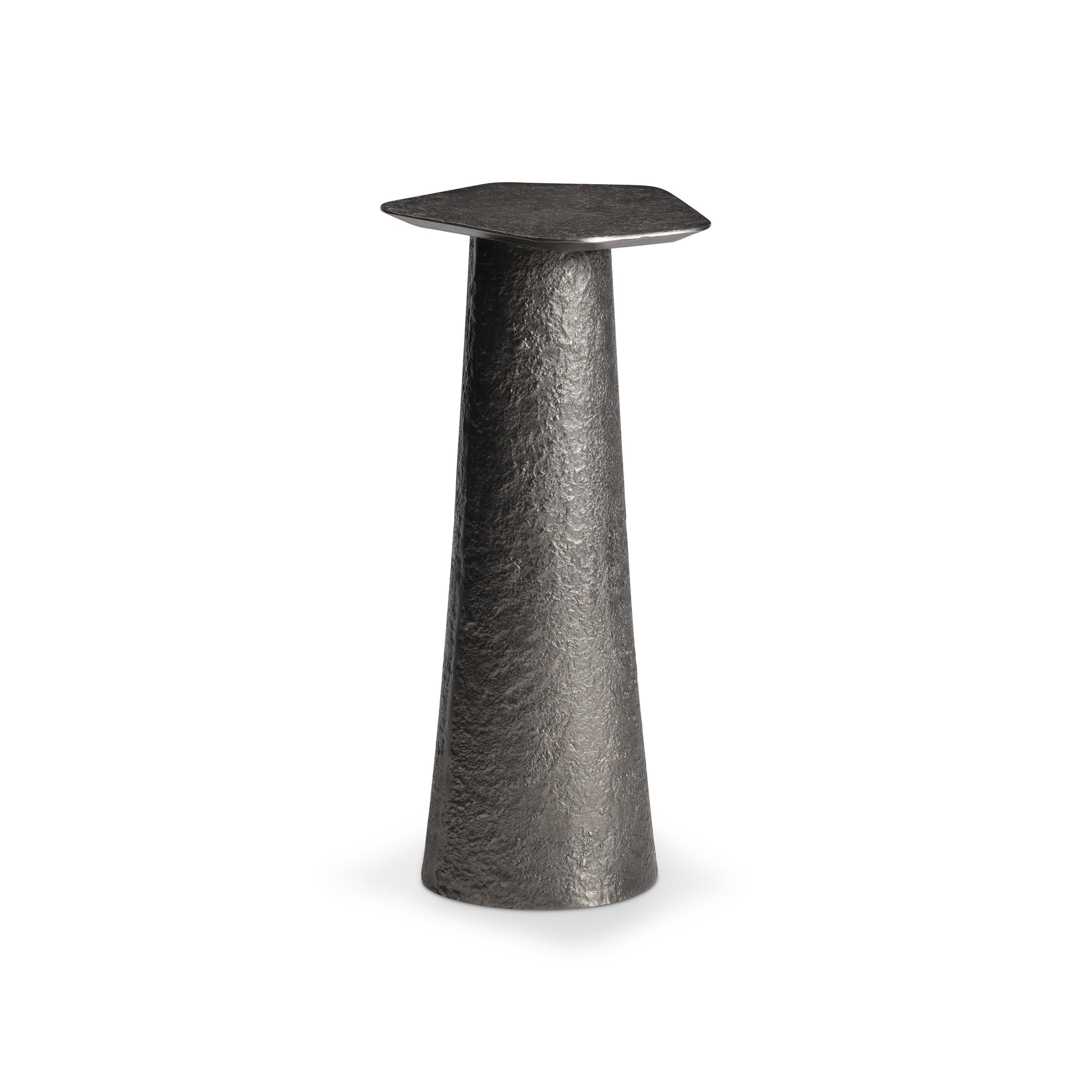 The Lark accent table blends organic curves with industrial strength to create a striking, modern accent piece. Crafted from cast aluminum in a rich Graphite finish, its conical base rises to support a cantilevered, five-sided top that adds sculptural interest and functional surface space—ideal beside a sofa, in an entryway, or as a bedside table.