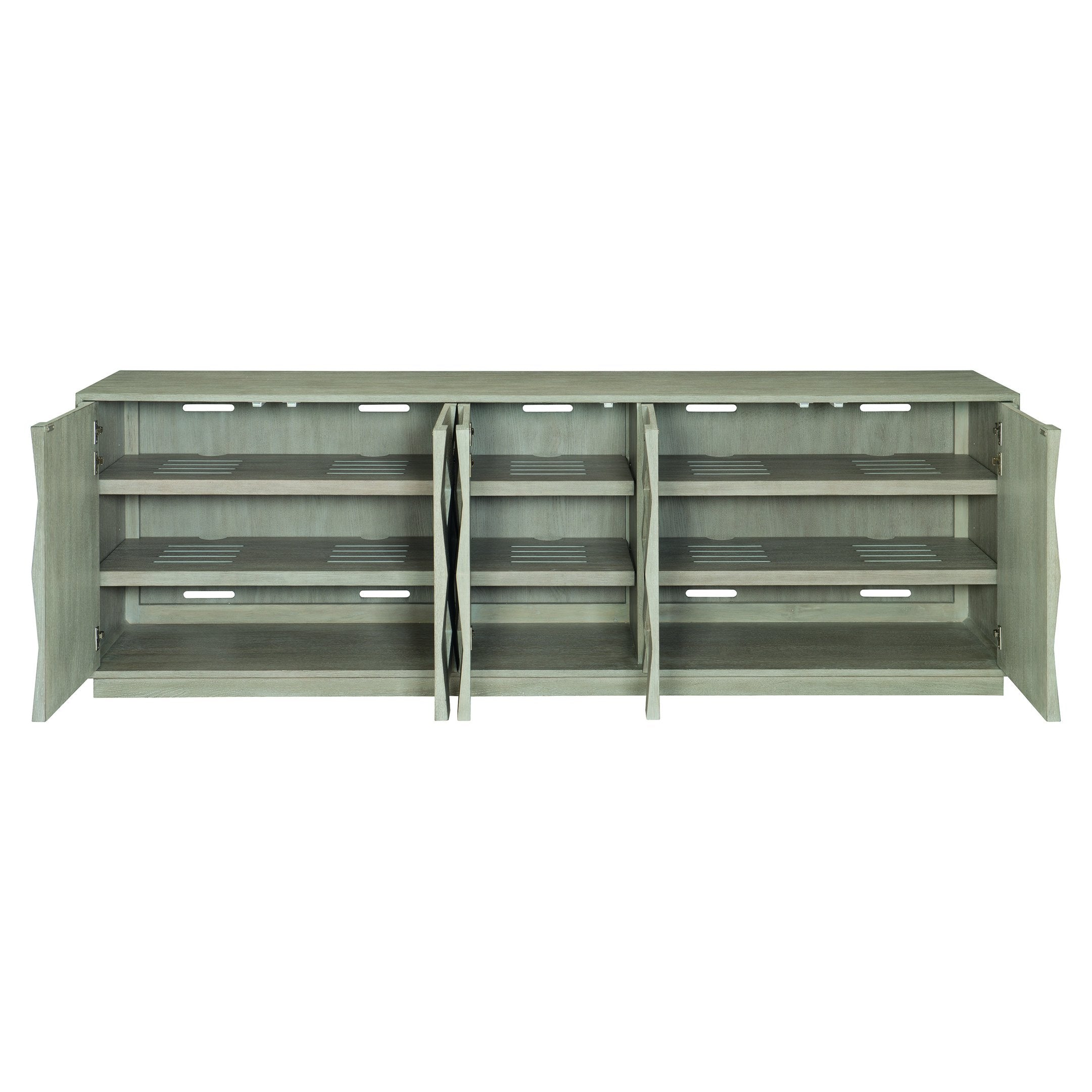Five push-to-open doors with dimensional fancy face door fronts. Behind each paired end doors and center door are two adjustable/removable, vented shelves with ventilation holes and grommet holes with covers in back panel for wire management.