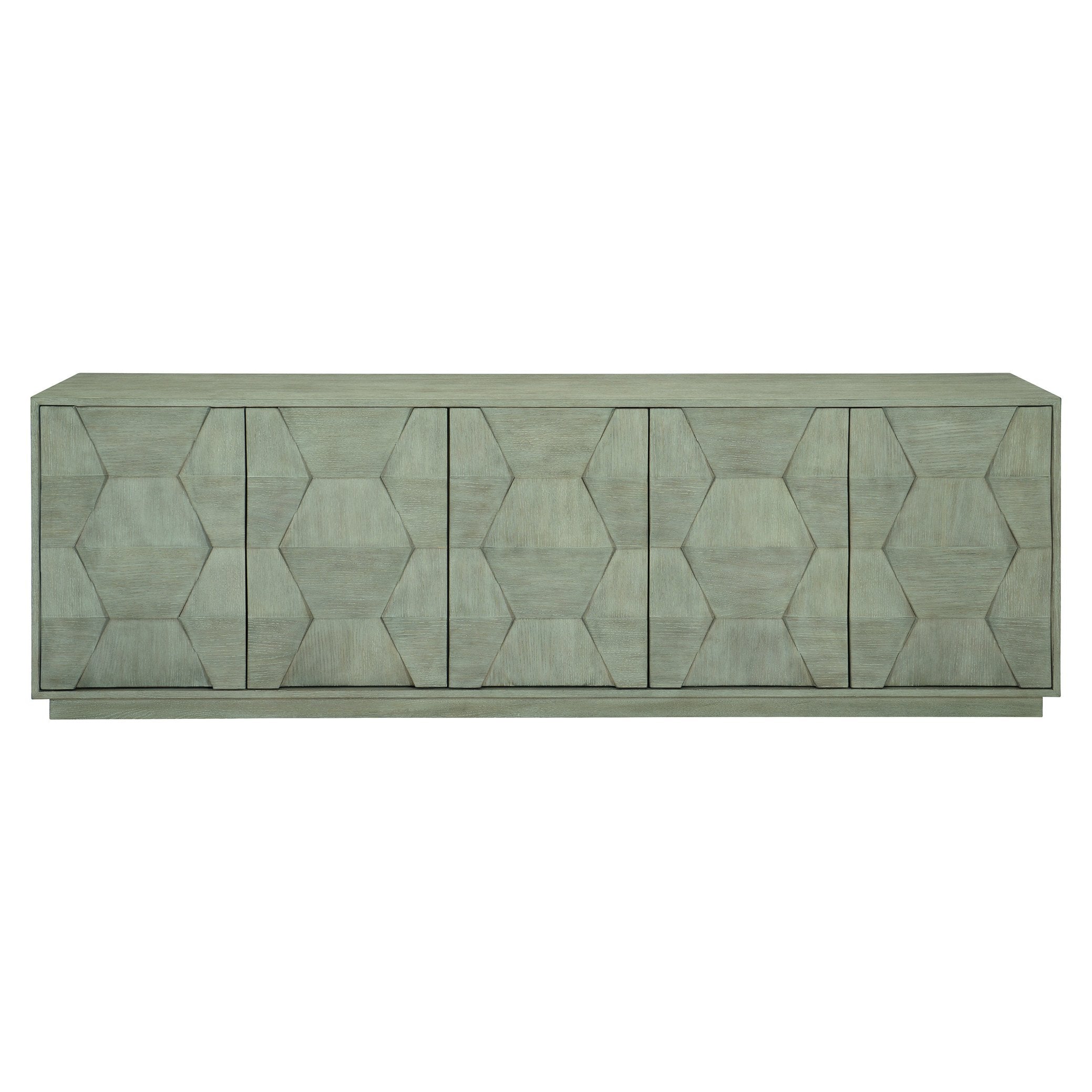 The Linea entertainment console combines rustic-modern character with thoughtful utility, delivering a refined focal point for your living room. Its cerused greige wire-brushed oak veneers and faceted veneer face create a textured, dimensional appearance, while push-to-open doors and integrated wire management keep the silhouette clean and contemporary. Built for media storage and display, this console balances handcrafted detail with everyday practicality.