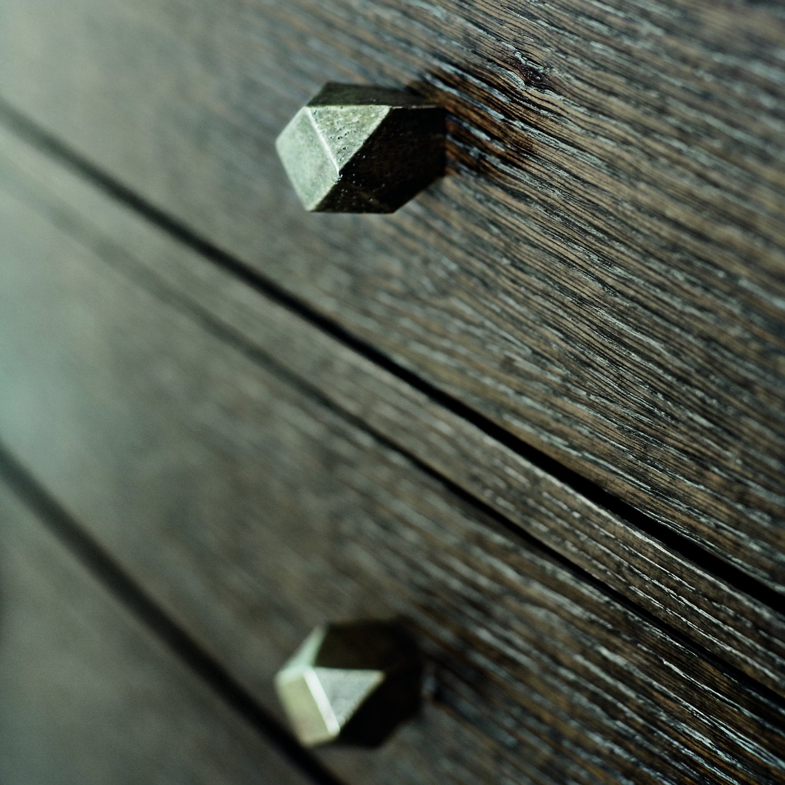 - Finish & Materials: Wire-brushed oak veneers with a Cerused Charcoal finish for subtle texture and depth; cast aluminum hardware in a Textured Graphite finish for a jewelry-like contrast.