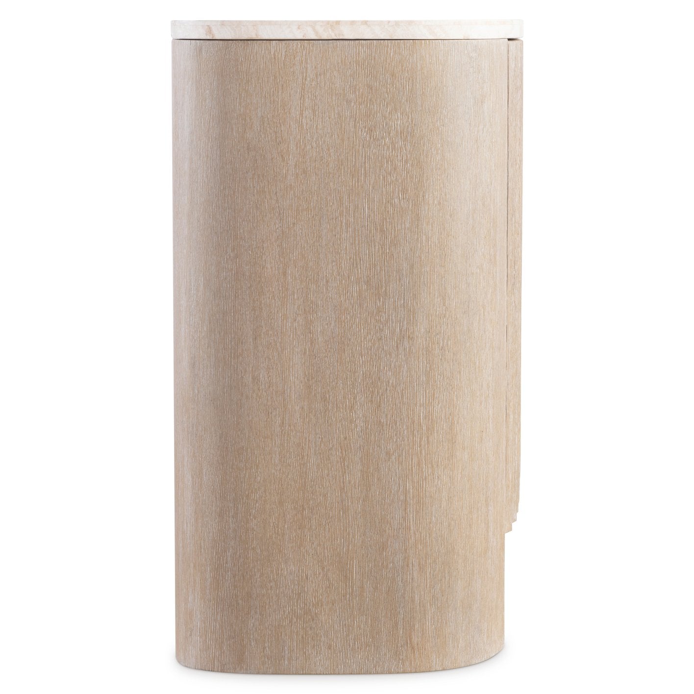 - Travertine stone top with rounded corners provides a durable, natural surface and visual contrast to the wood case