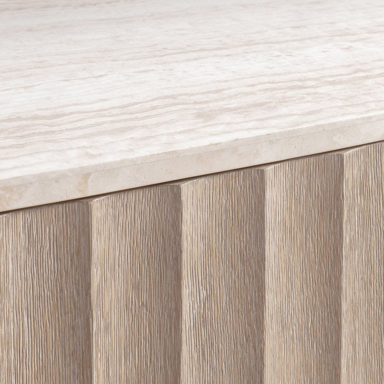 Elevate your dining or living space with the Loggia buffet — a modern, sculptural storage piece that blends refined materials and thoughtful detailing. Its fluted door faces, scalloped contours, and travertine stone top create a sophisticated focal point while offering flexible storage and smooth, quiet operation for everyday use.