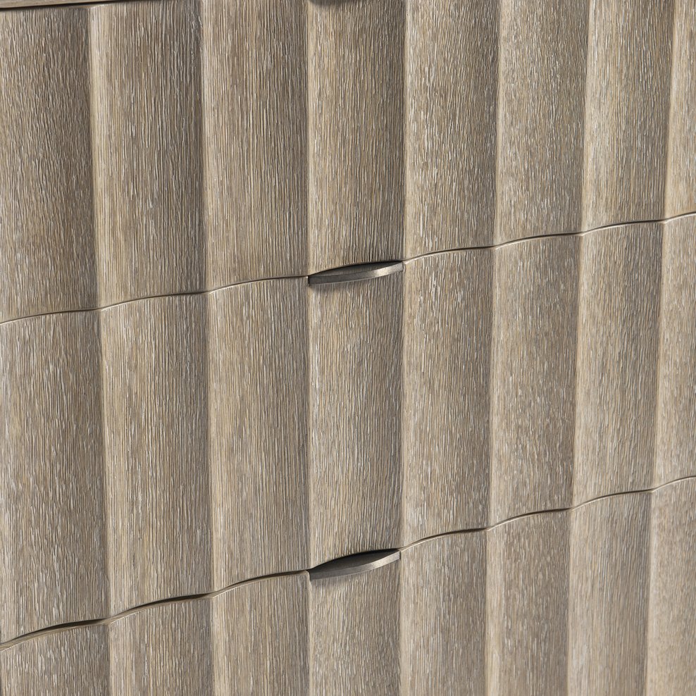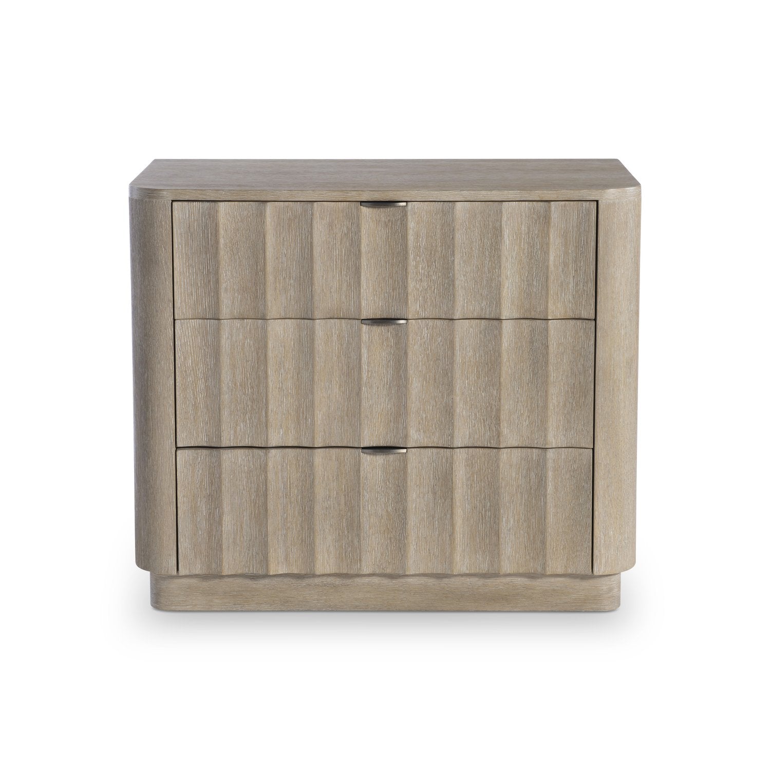 Elevate your bedroom with the Loggia three-drawer nightstand — a modern piece that blends refined craftsmanship with practical functionality. Its sculpted fluted drawer fronts and warm Aria finish give the nightstand a tailored, architectural look while the wood top and plinth base provide visual balance. Thoughtful details like stainless-steel tab pulls and an integrated USB charging unit make it an ideal bedside companion for contemporary living.