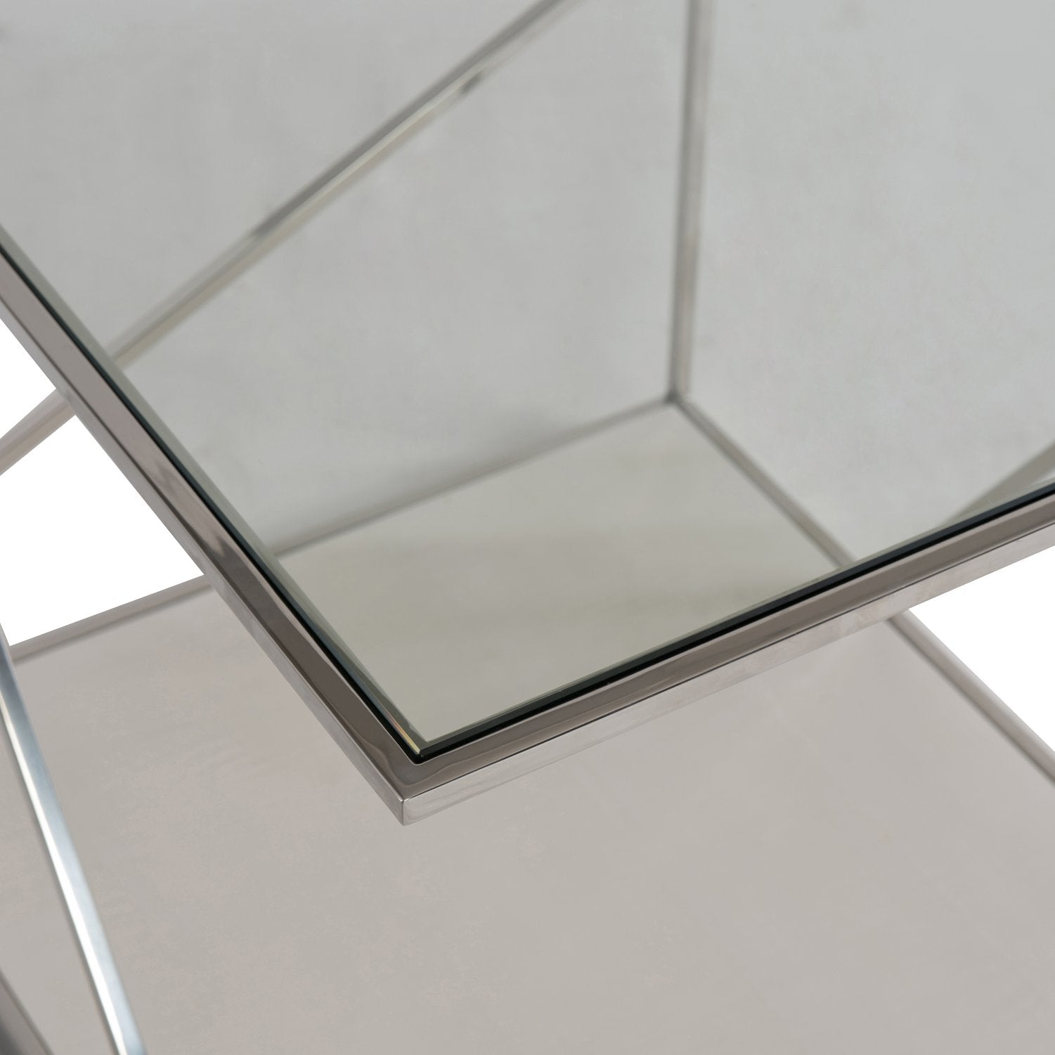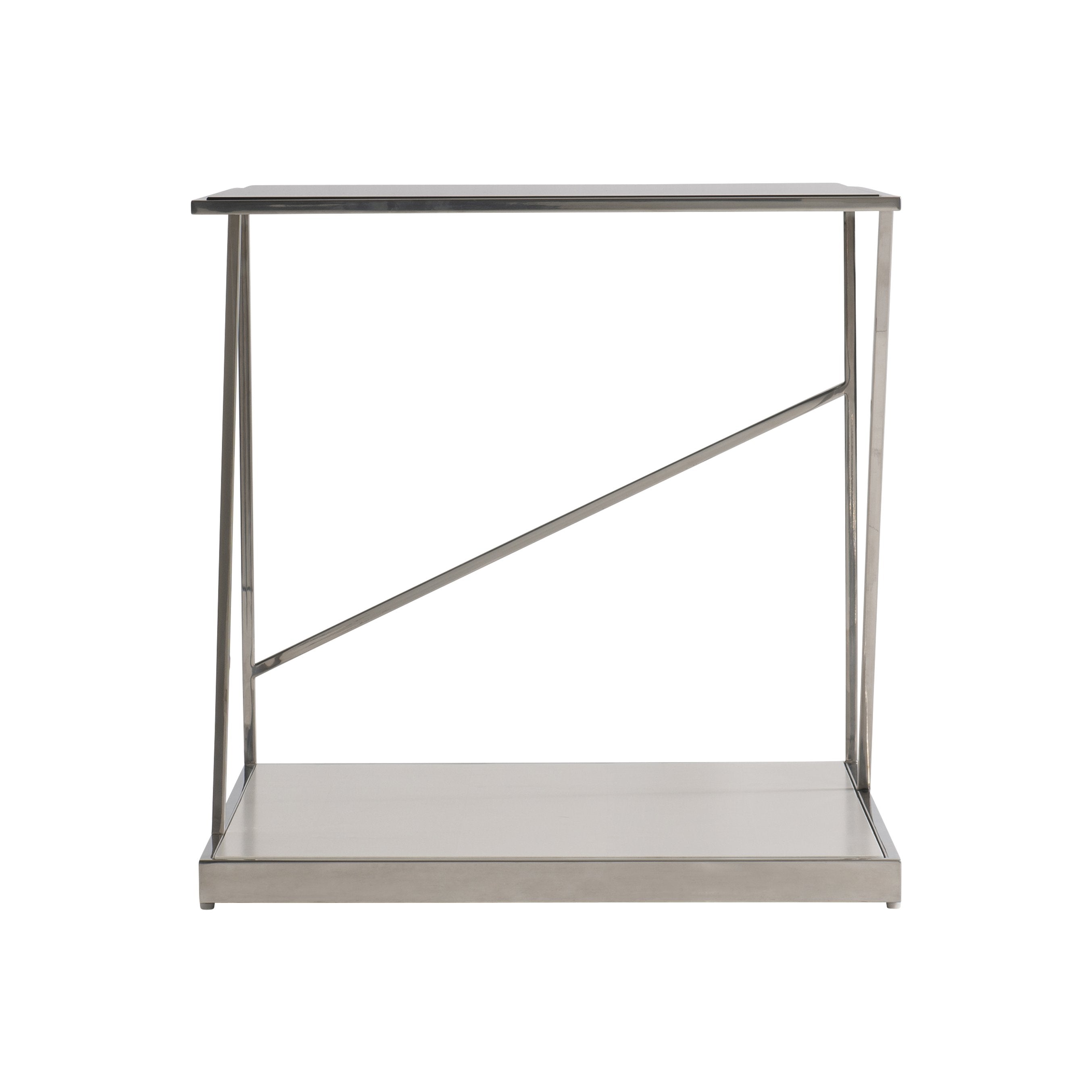- Construction: Polished stainless steel metal frame with clean, angular geometry—one diagonal stretcher at the back and two on each side—for structural support and visual interest