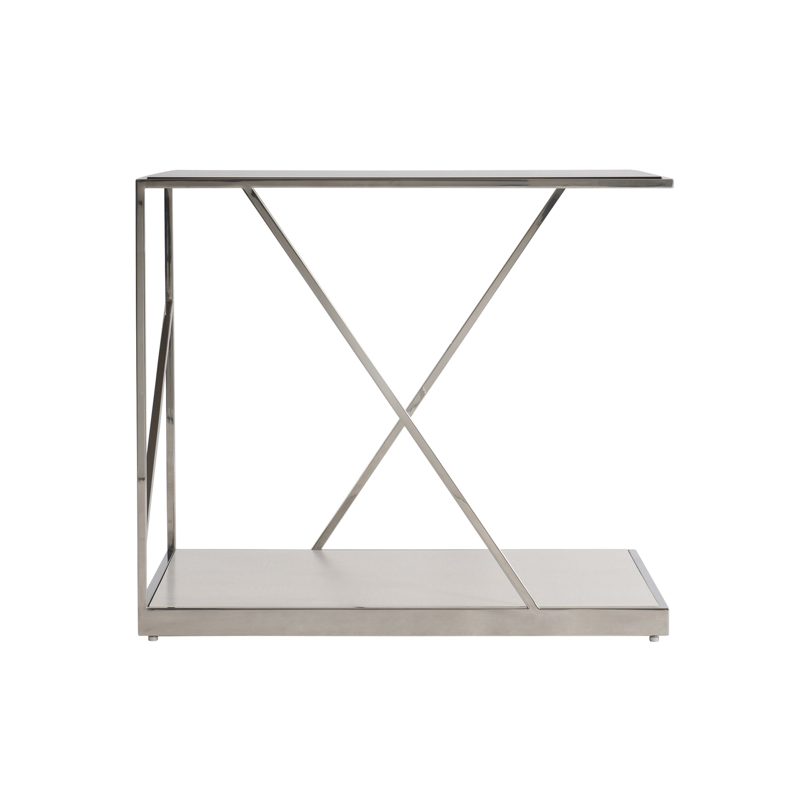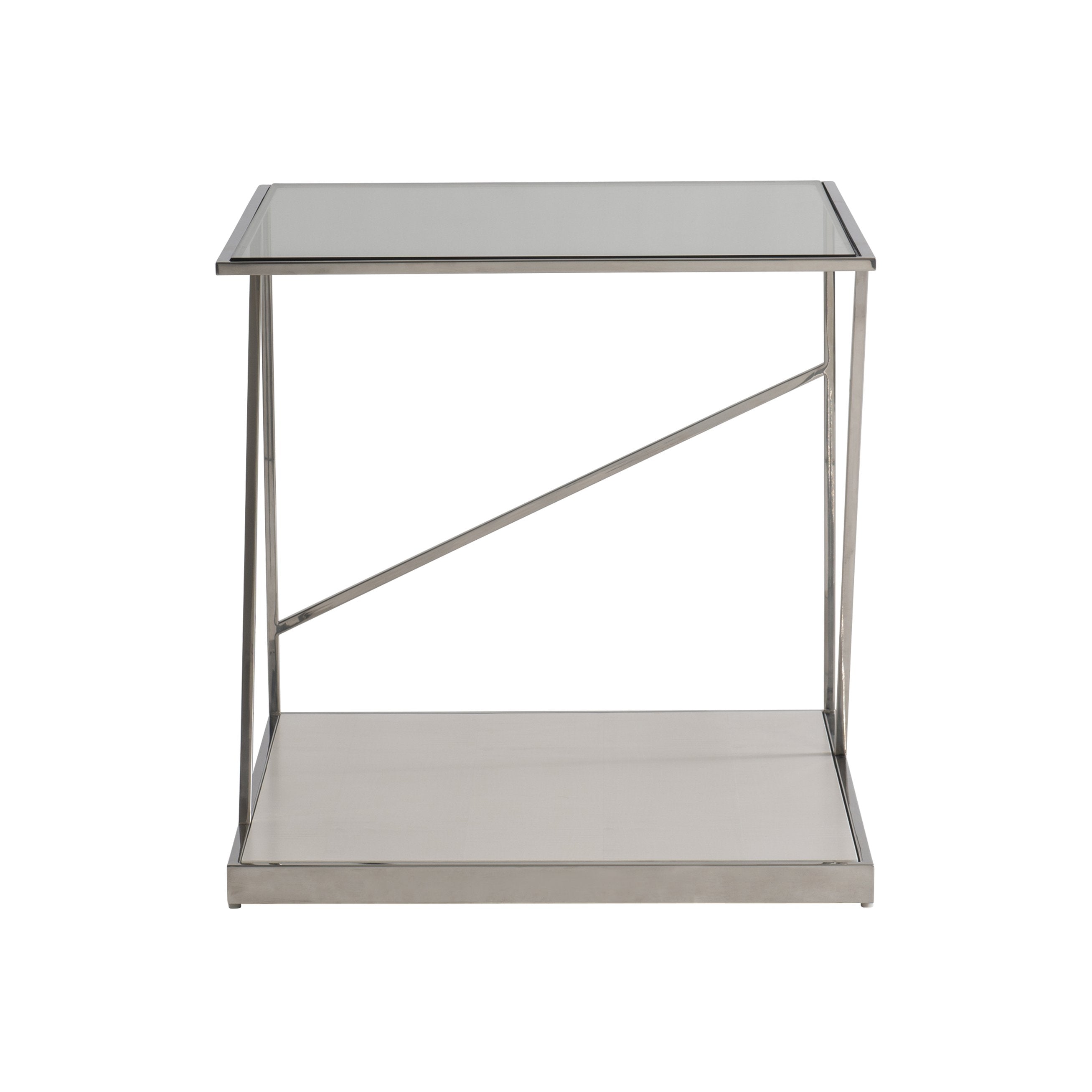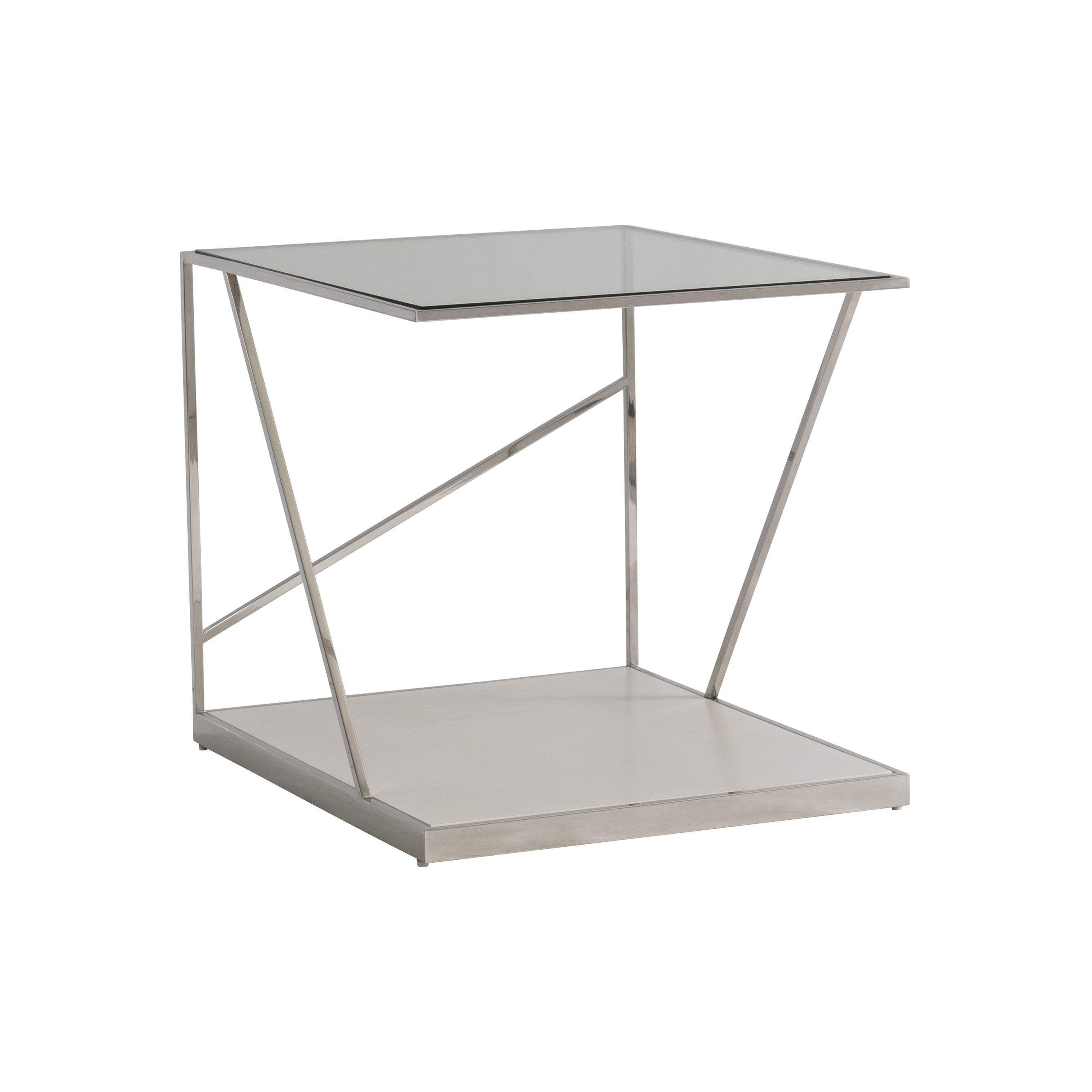 Clean, contemporary geometry and refined materials define this Maymont side table, designed to bring modern sculptural presence to living rooms, bedrooms, or office spaces. Polished stainless steel framing contrasts with warm figured sycamore and clear tempered glass to create a light, airy silhouette that reads as both artful and functional. The table’s balanced proportions and inset surfaces make it a versatile accent piece for displaying books, lighting, or decor.