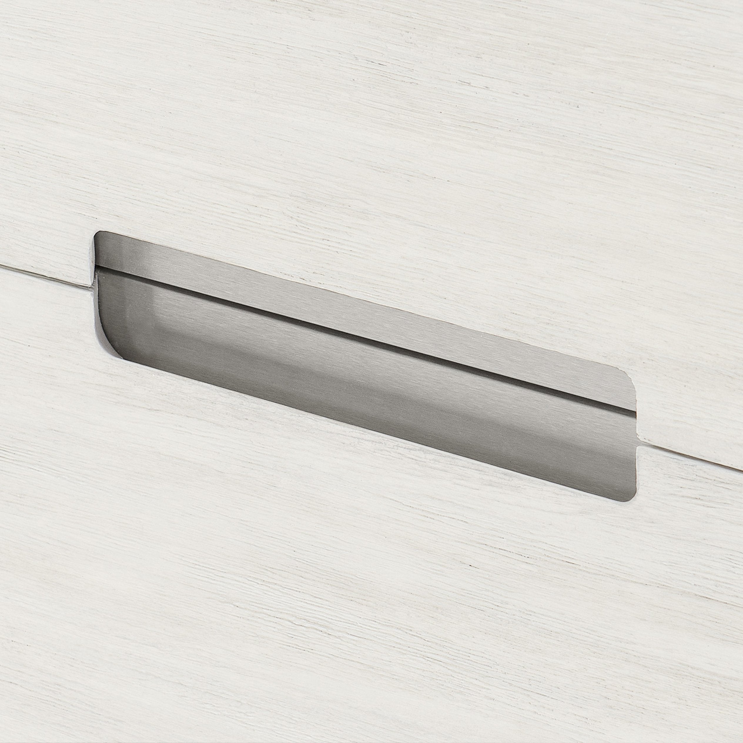 - Two soft-closing drawers with finger pulls and inset brushed stainless steel plates for a clean, minimal look