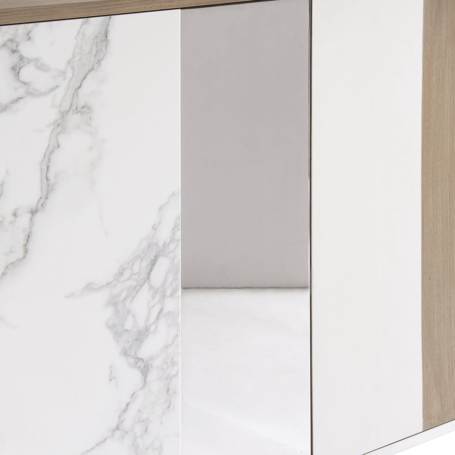 - Design & Finish: Modulum Sahara finish on veneered carcass; door fronts and end panels feature alternating vertical panels of wood, faux marble, polished stainless steel and Adobe faux stone for a layered, geometric look.