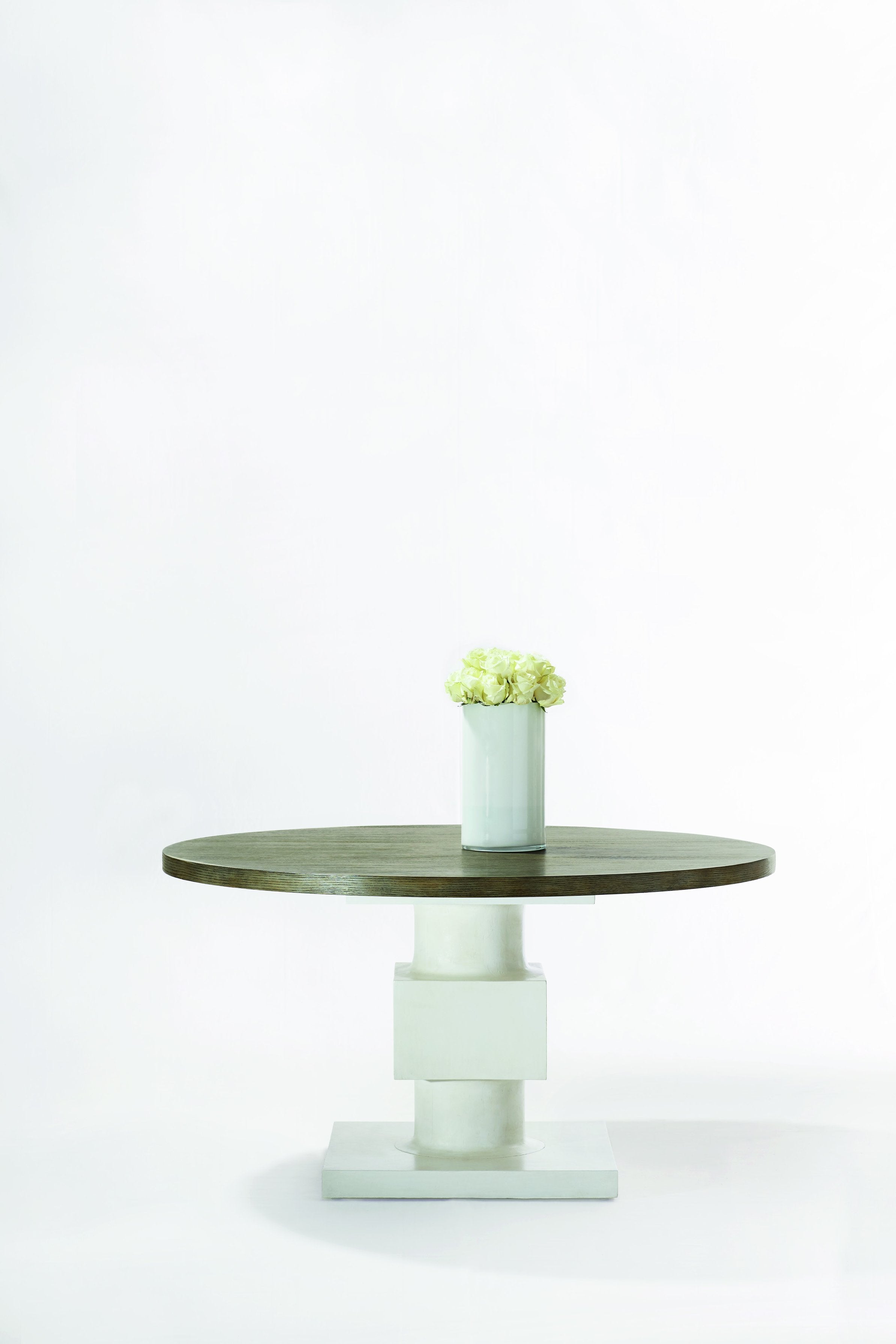 Elevate your dining space with a modern, sculptural centerpiece that blends contrasting textures and geometric design. This round dining table combines a warm, rustic oak surface with a sleek plaster-finished pedestal to create a refined yet approachable look that suits contemporary and eclectic interiors alike.