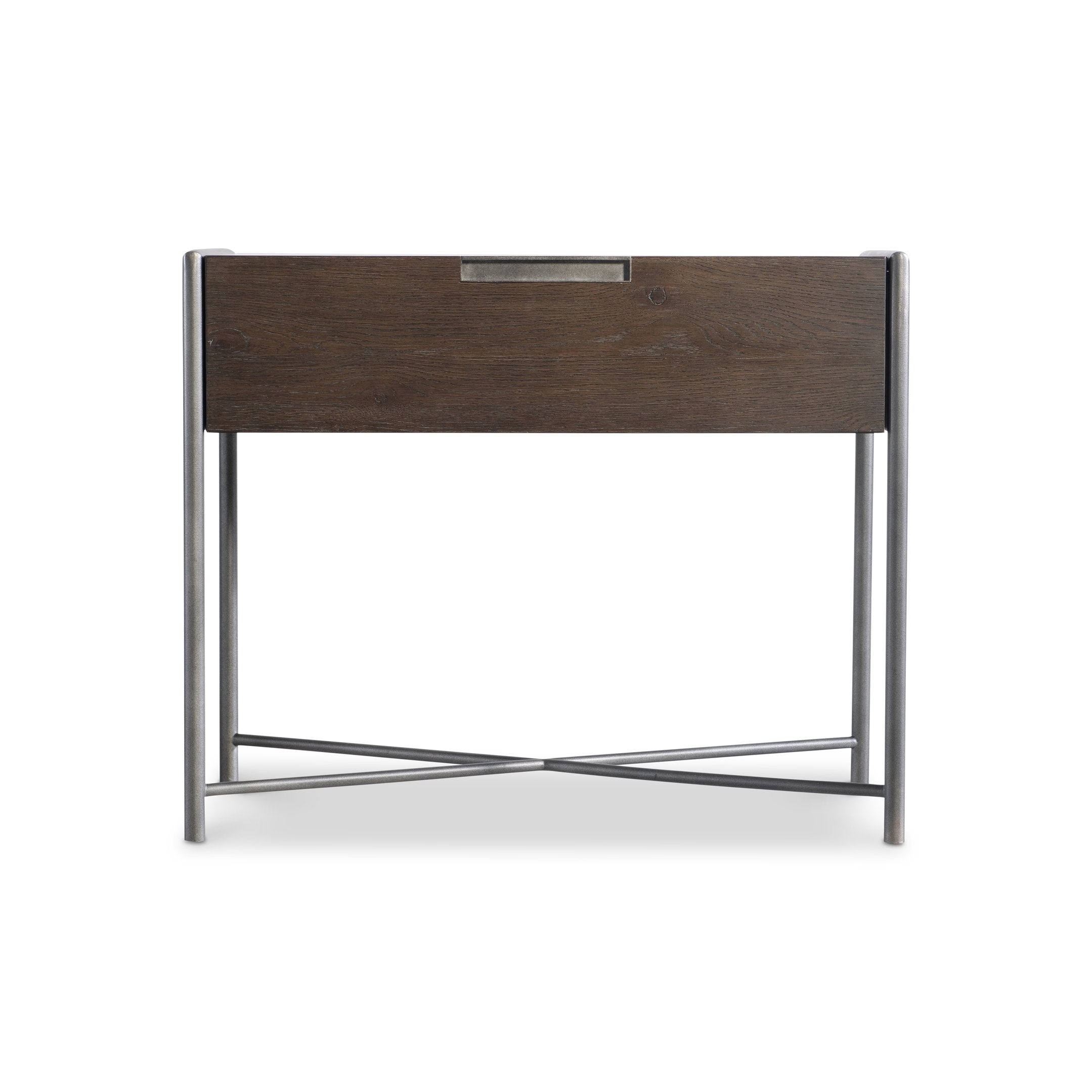 An artfully modern bedside piece, this nightstand blends warm wire-brushed oak with a textured metal frame for a striking yet understated silhouette. Thoughtful details—like a soft-close drawer, recessed metal pull, and open base with stretcher—combine form and function to elevate your bedroom with casual modern style.