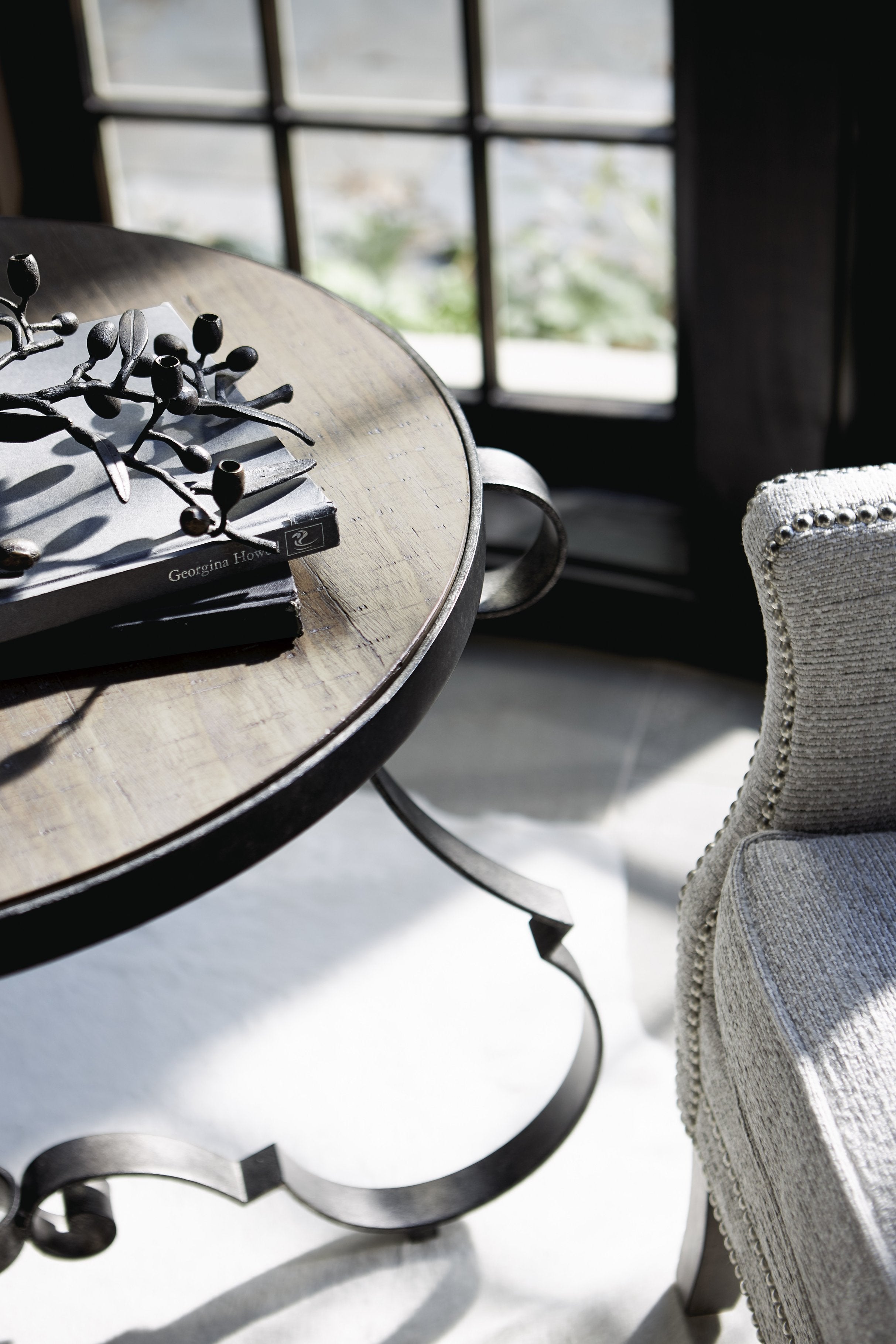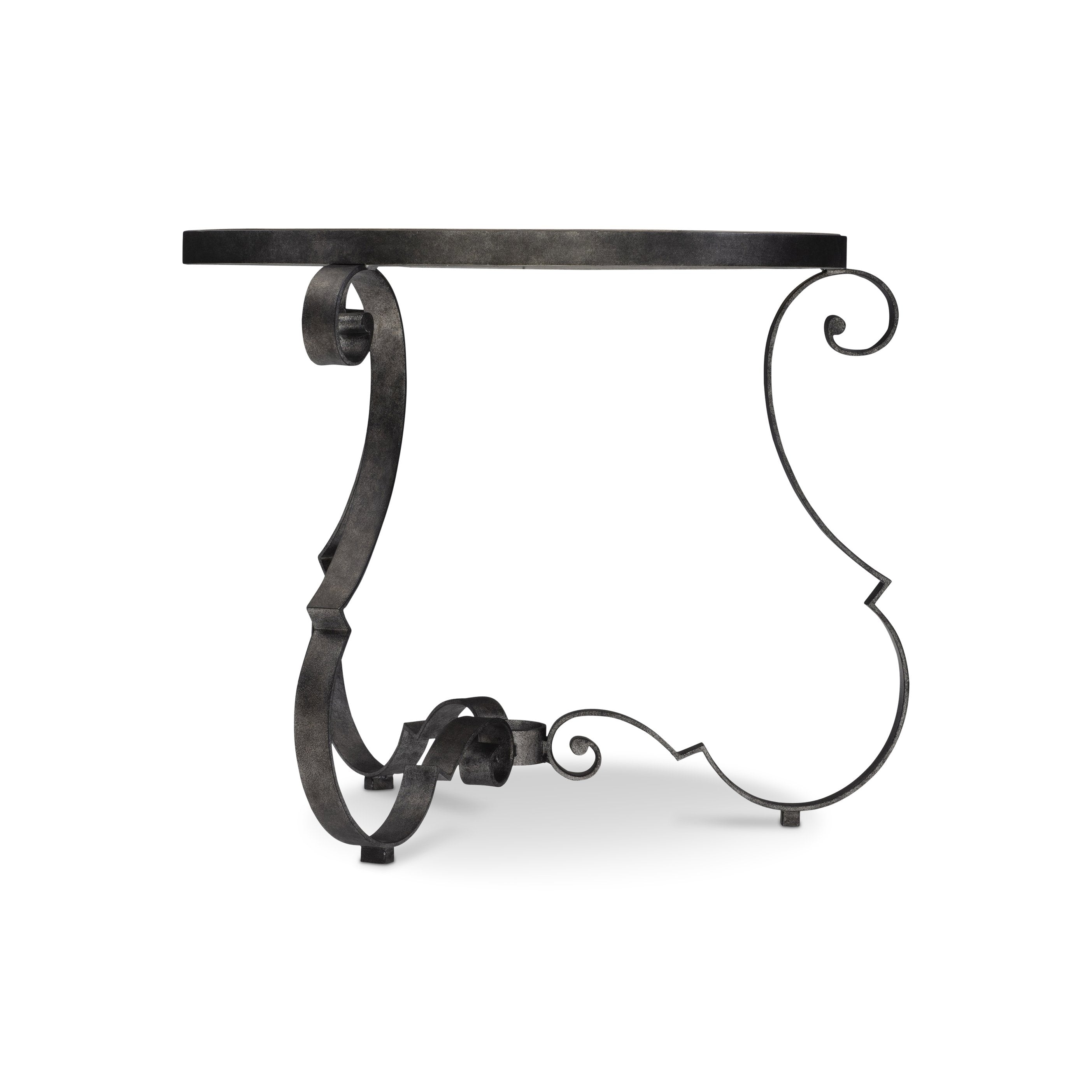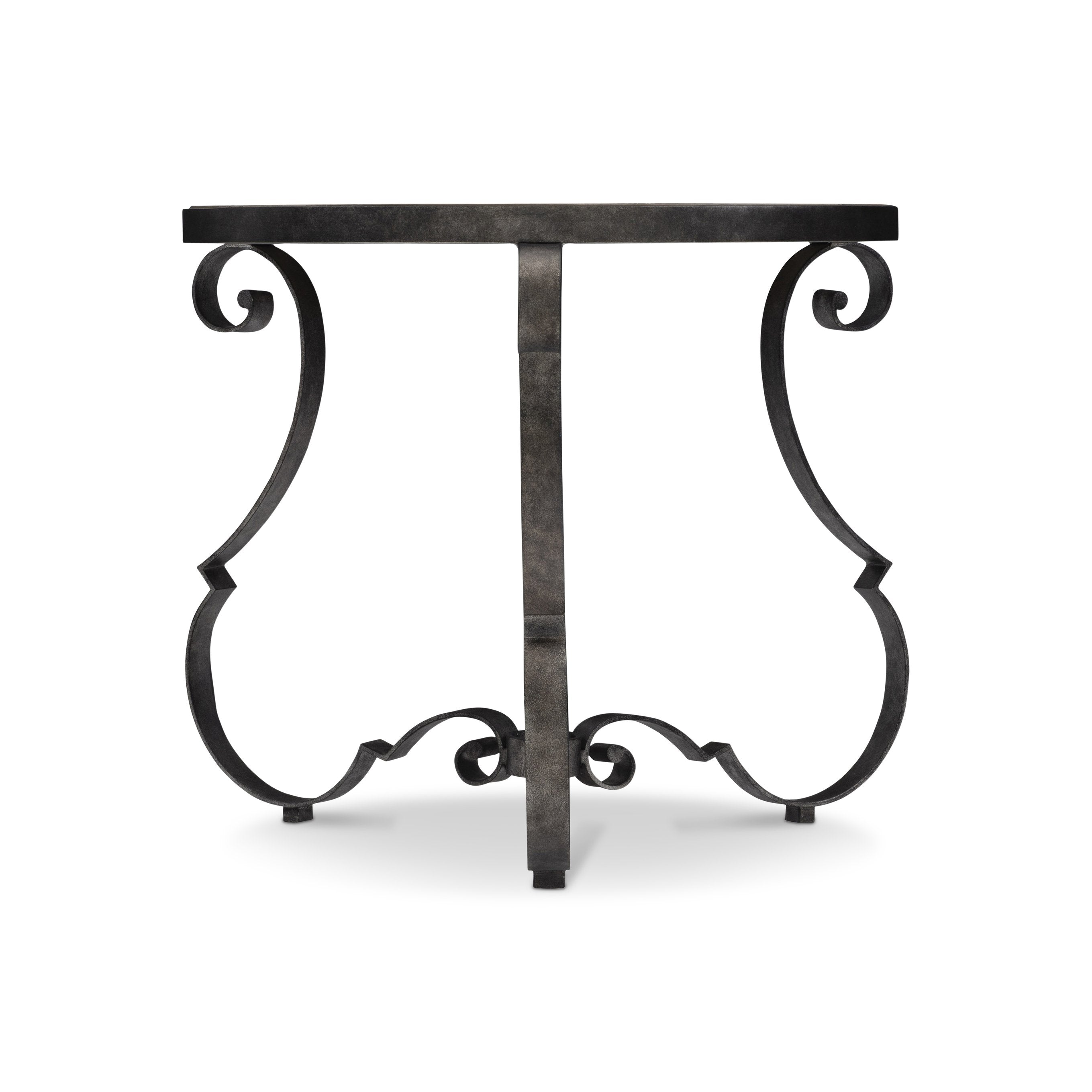 Evoking the romance of traditional Italian design, this round side table combines sculptural metalwork with a distressed pine top to create an elegant yet relaxed accent piece. Its curvaceous silhouette and detailed scrollwork bring a touch of Renaissance-inspired charm, while the Textured Carbone finish and visible wood character provide an authentic, timeworn appearance that complements both casual and traditional interiors.