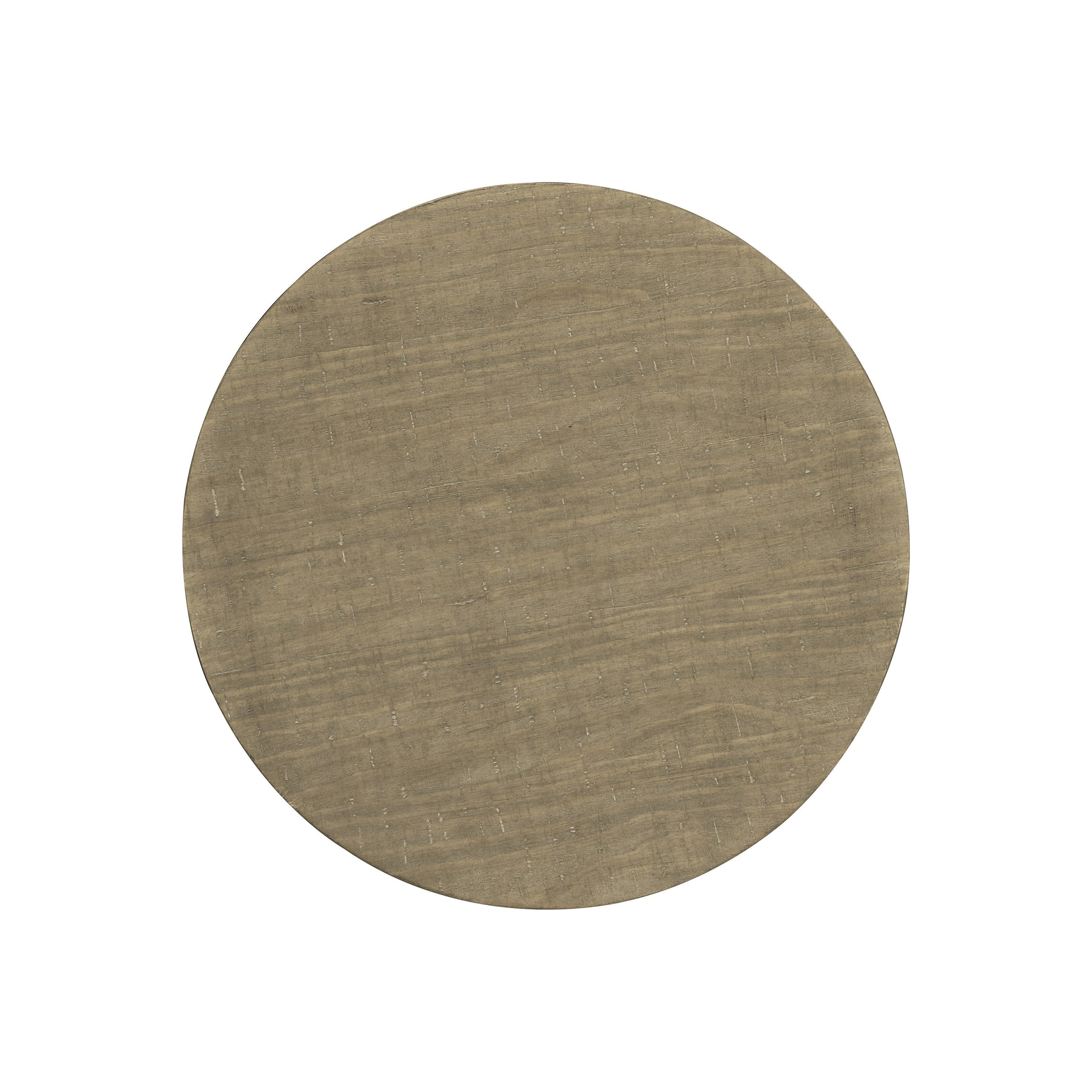 - Inset round top veneered in distressed Criollo pine with visible rifting, scratches, and knots for old-world character