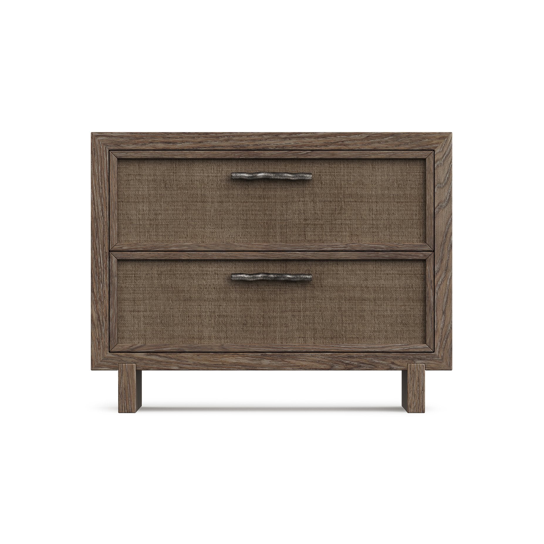 - Drawer Details: Two soft-close drawers featuring wood-framed fronts inset with woven material in Light Playa finish; cast metal hardware in an Anthracite finish provides an organic, hand-forged look