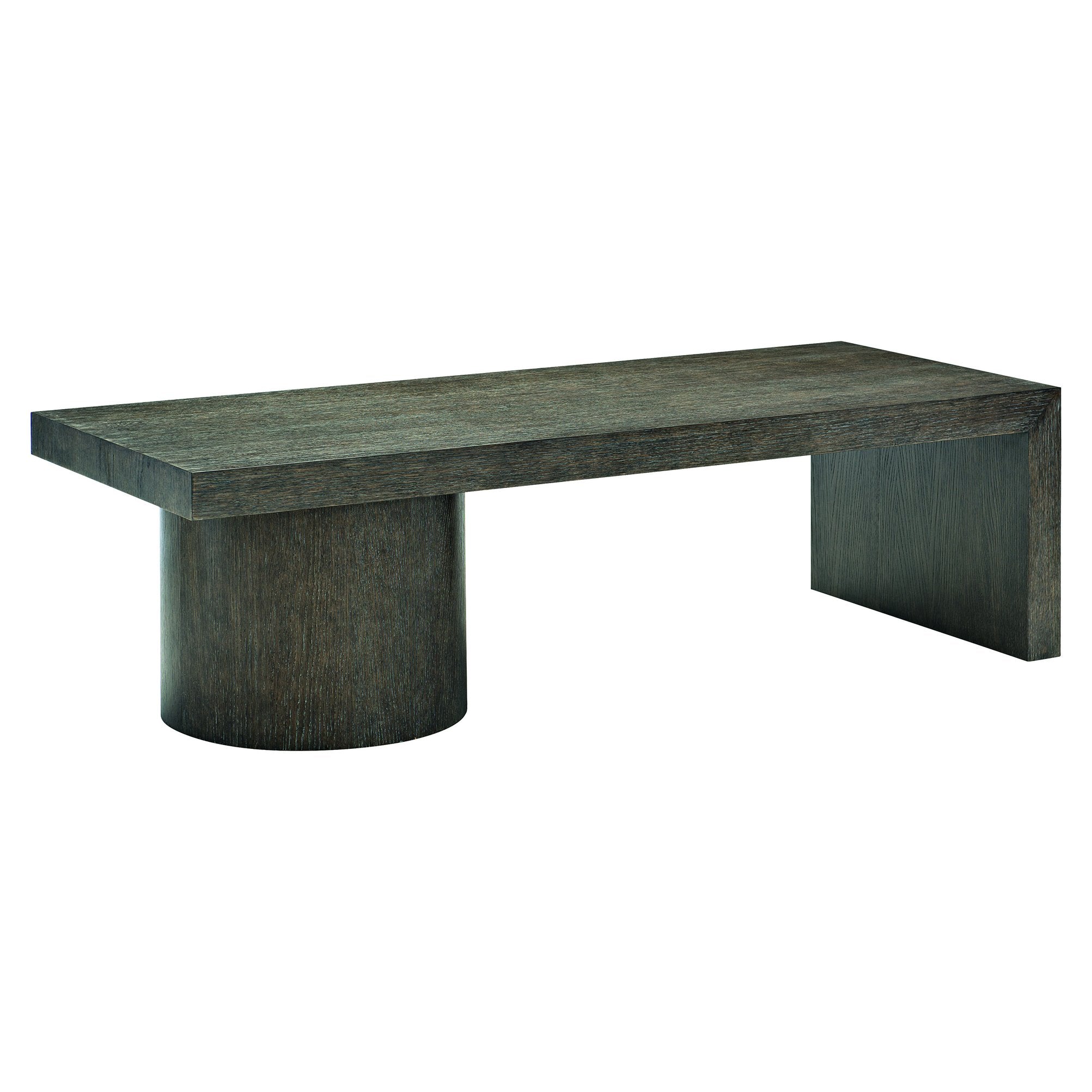 Bring rustic modern elegance to your living room with this distinctive rectangular cocktail table. Its sculptural silhouette pairs contrasting geometric elements — a full-height end panel and a centered round pedestal — creating visual interest while maintaining a clean, understated profile. Expertly wire-brushed oak veneers and a Cerused Charcoal finish highlight the grain with subtle white hang-up, giving the piece texture and depth without overpowering a space.