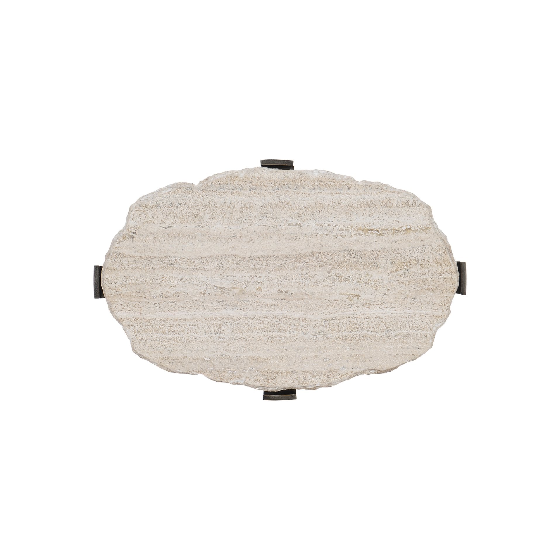 - Oval laminated white travertine stone top with a hand-chiseled edge for tactile detail and visual depth