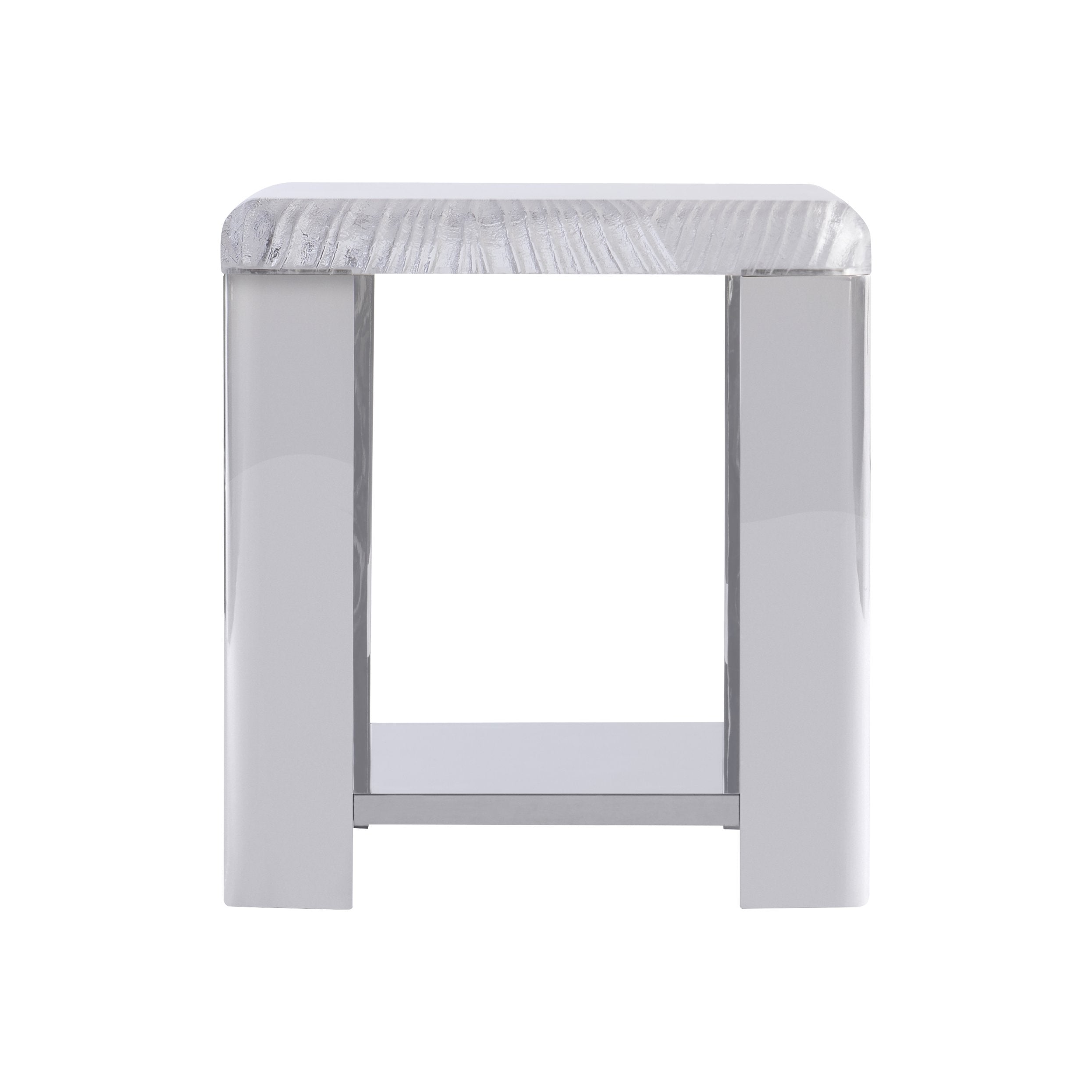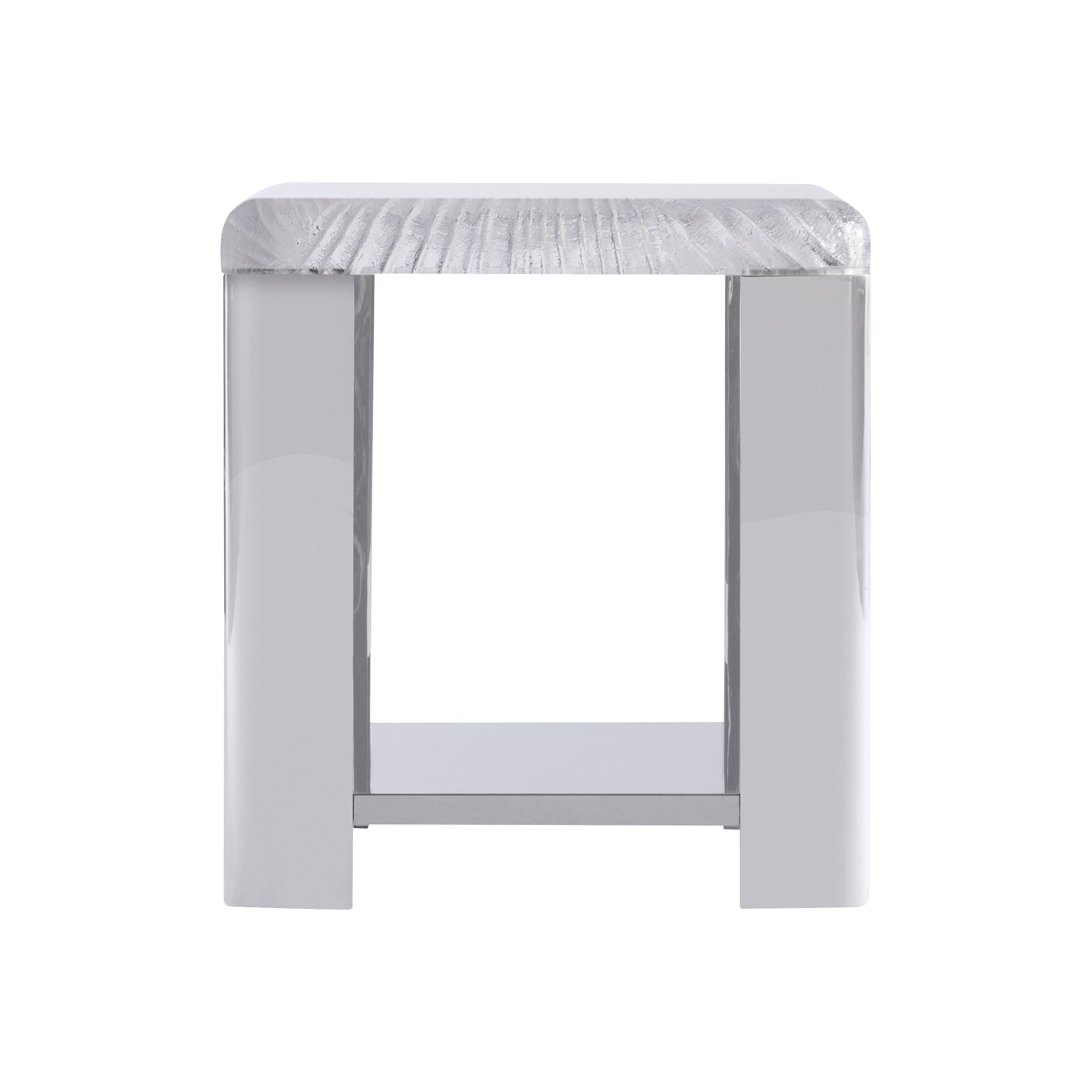 Elevate any room with the Bernhardt Aura Side Table — a striking blend of sculptural art and modern materials. Its intricately carved acrylic top mimics the fluidity of carved ice, while the high-gloss stainless steel frame and shelf capture and reflect the table’s pattern for a luminous, gallery-worthy accent that works equally well beside a sofa, chair, or bed.